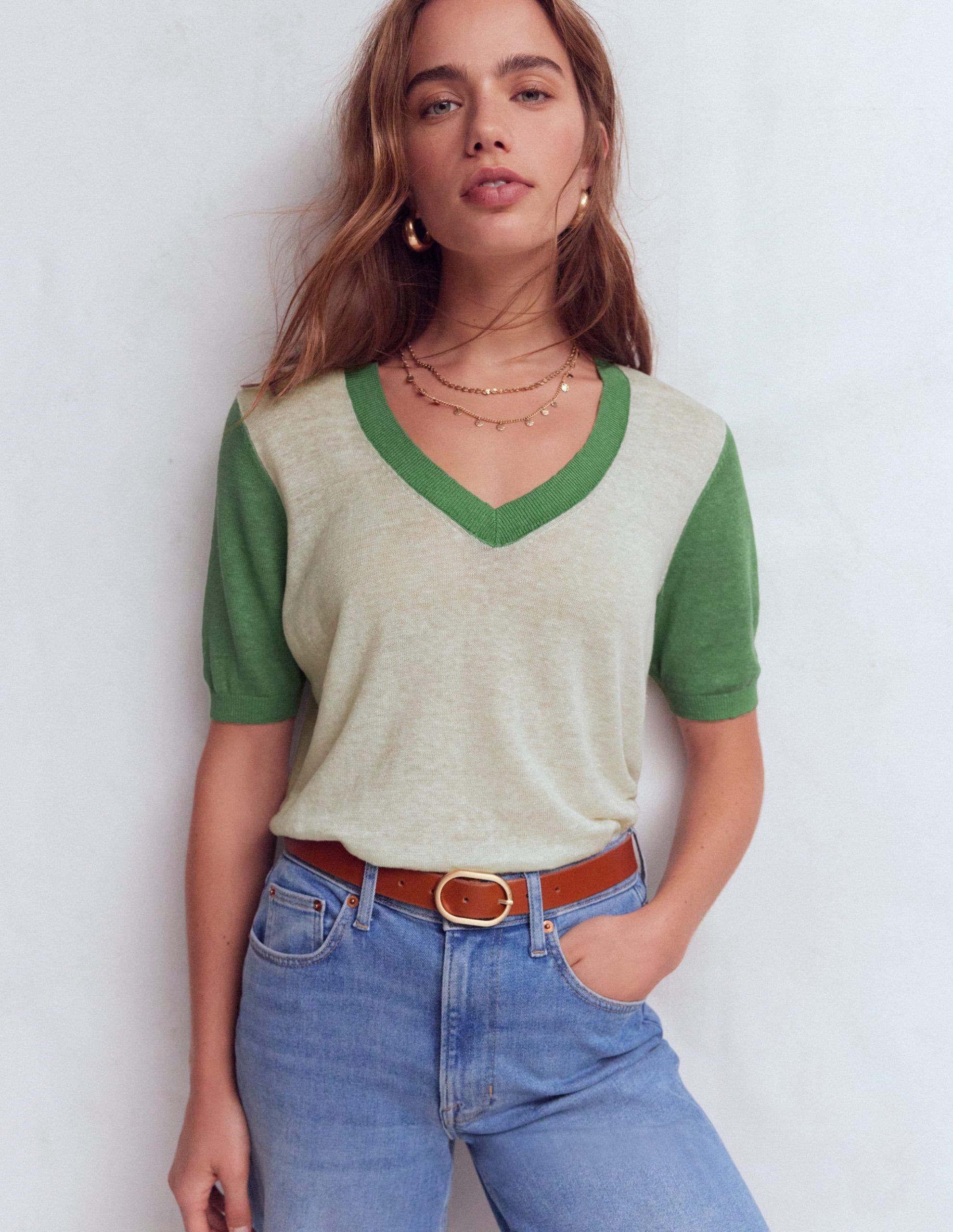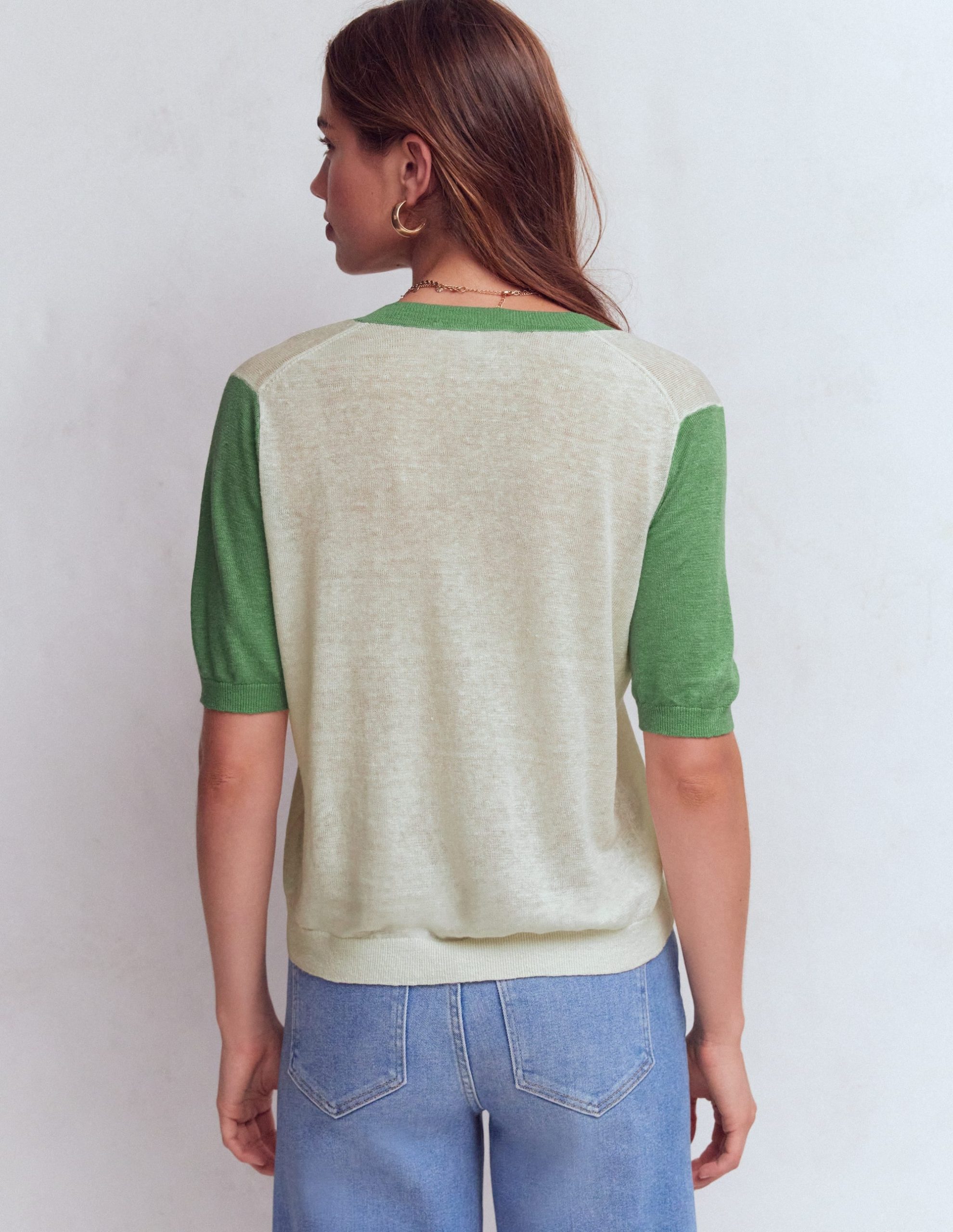 Agnes Linen V Neck T-Shirt-Ivory/ Green