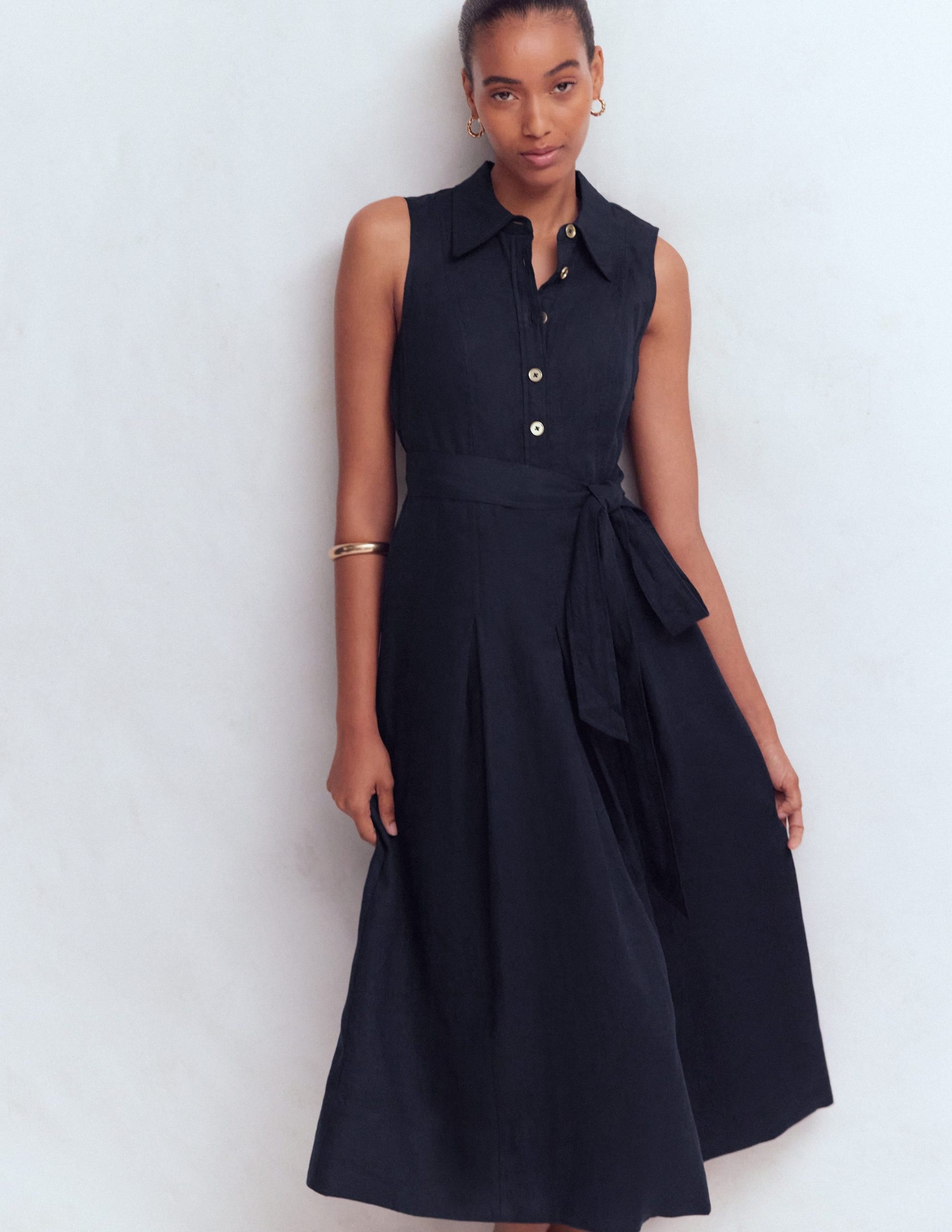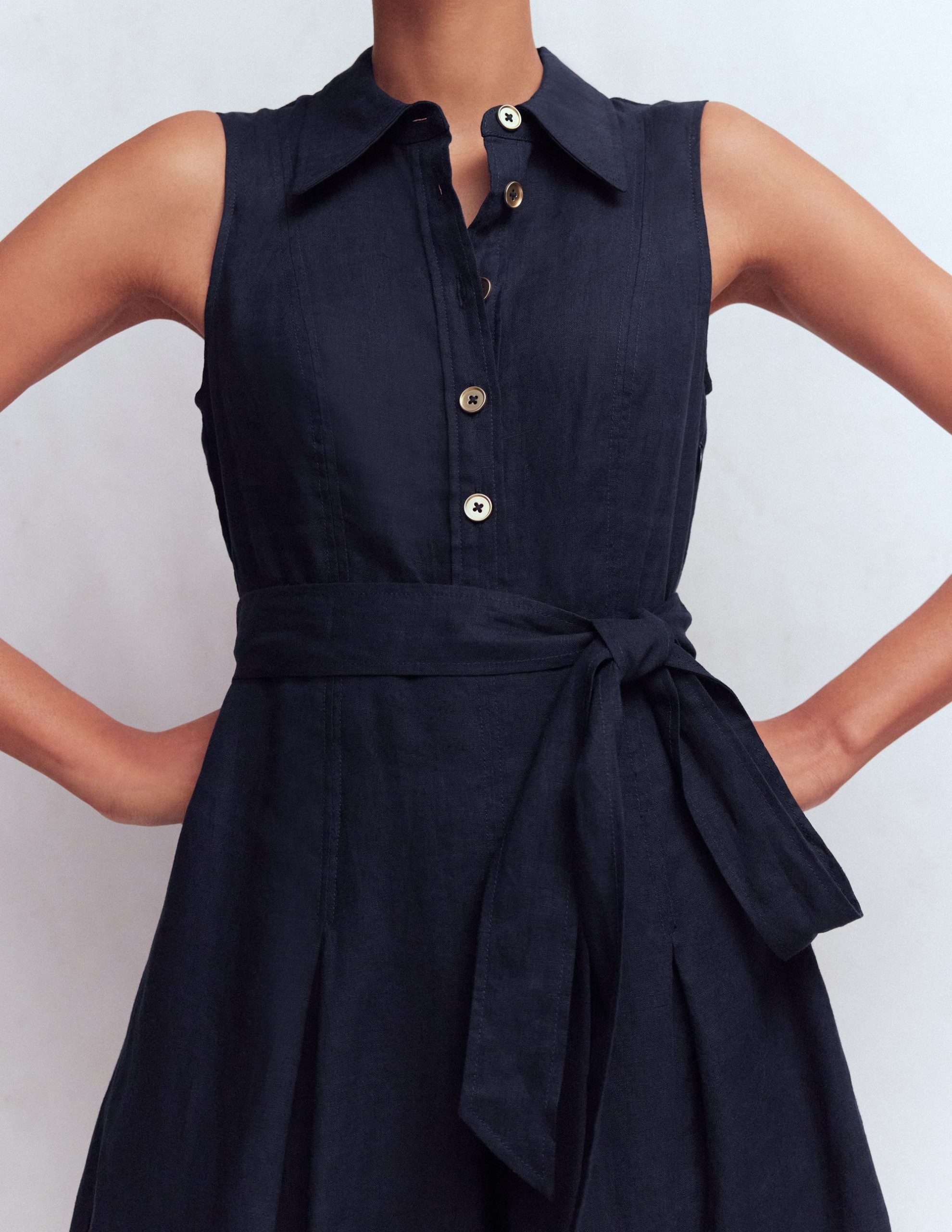 This sleeveless linen shirt dress delivers on comfort and polish in equal measure. The princess seams. self-tie belt and full skirt creates an elegant. flattering silhouette. Style it with heels for everything from work to weekend dinners out and feel your most confident self.