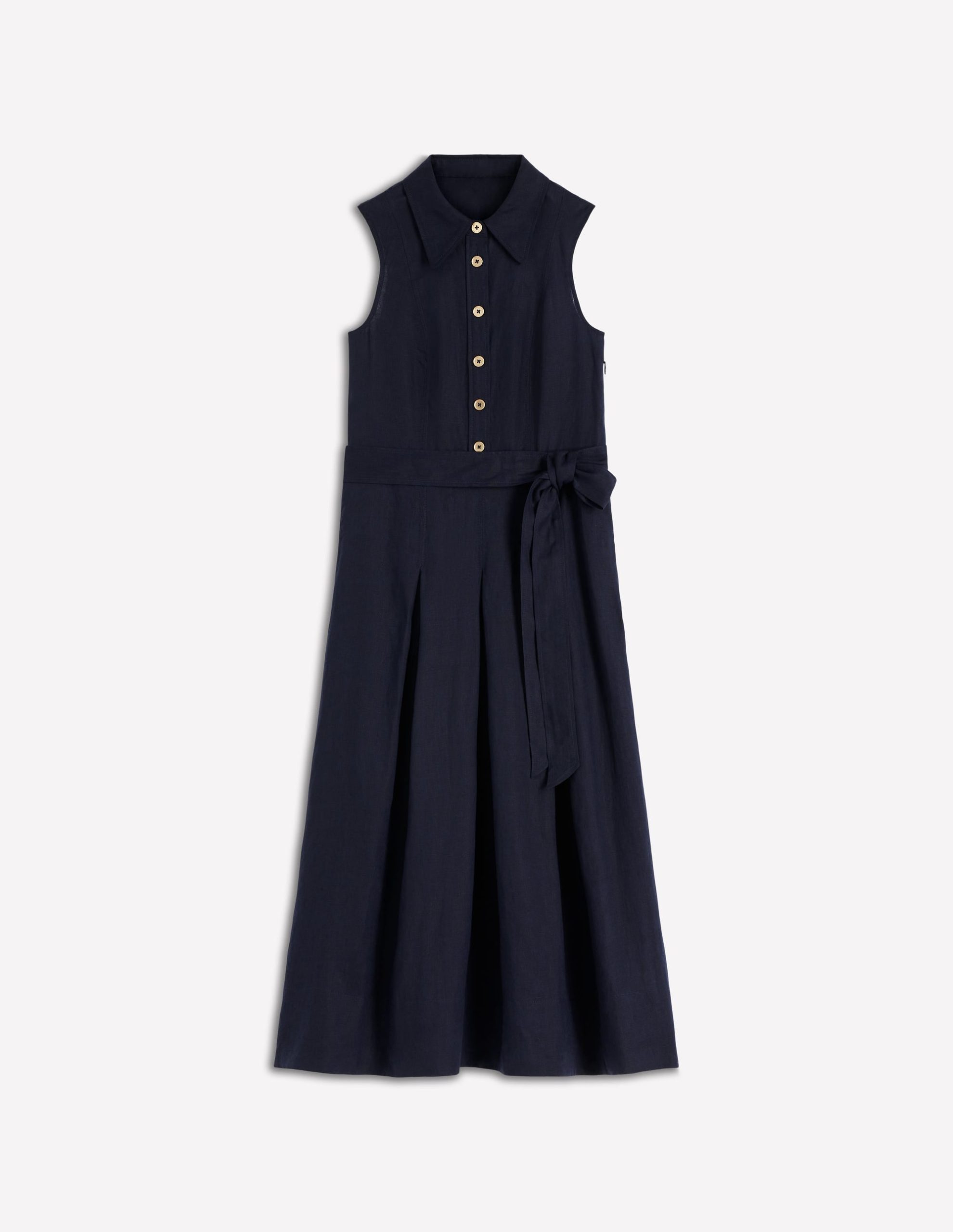 This sleeveless linen shirt dress delivers on comfort and polish in equal measure. The princess seams. self-tie belt and full skirt creates an elegant. flattering silhouette. Style it with heels for everything from work to weekend dinners out and feel your most confident self.