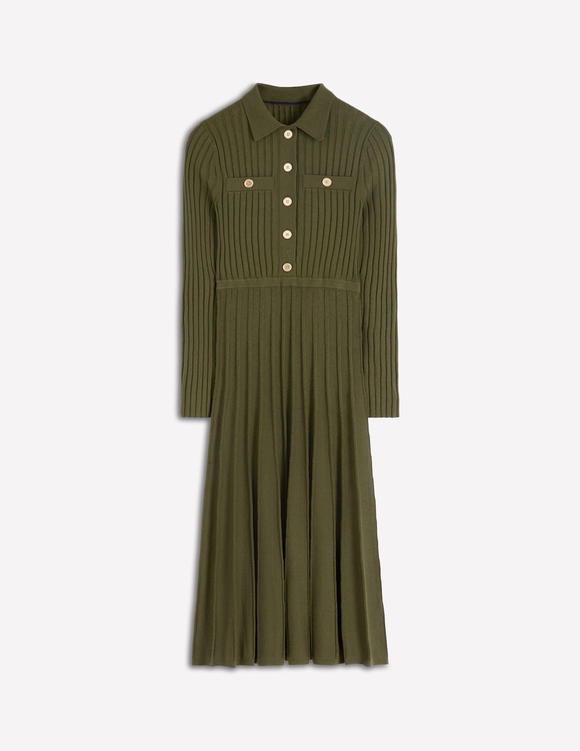 A dress to lift your spirits on the dreariest of work days. This warmer ribbed version of a classic shirt dress is crafted from a cotton and wool blend. We added rich colours, gold button detail and a flattering figure-skimming shape just for you.