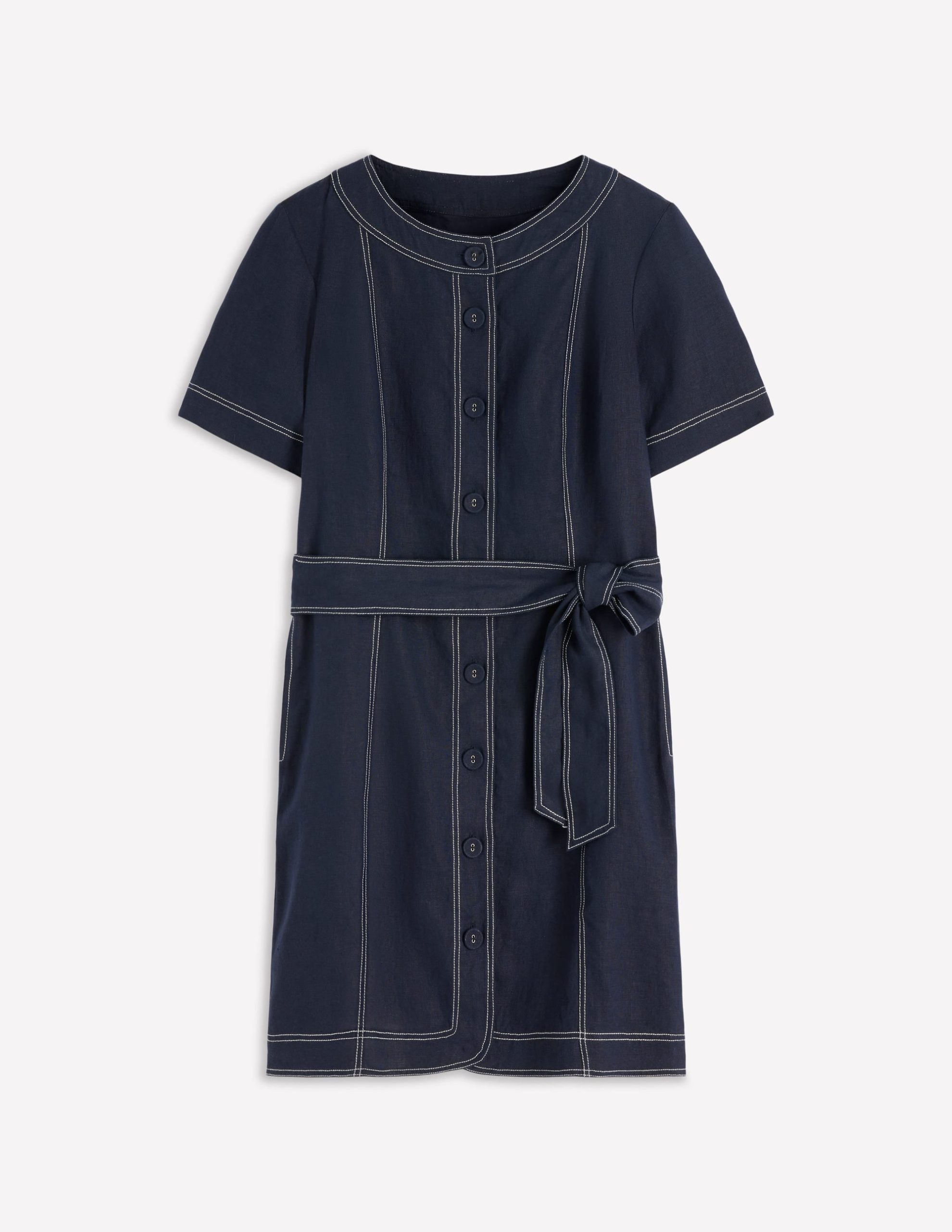A linen dress that’s built to keep you cool on hot days and still boost your confidence in the office. It features invisible buttons and contrast stitching. Plus. the princess seams and self-tie belt add structure. Wear it to feel great all day.