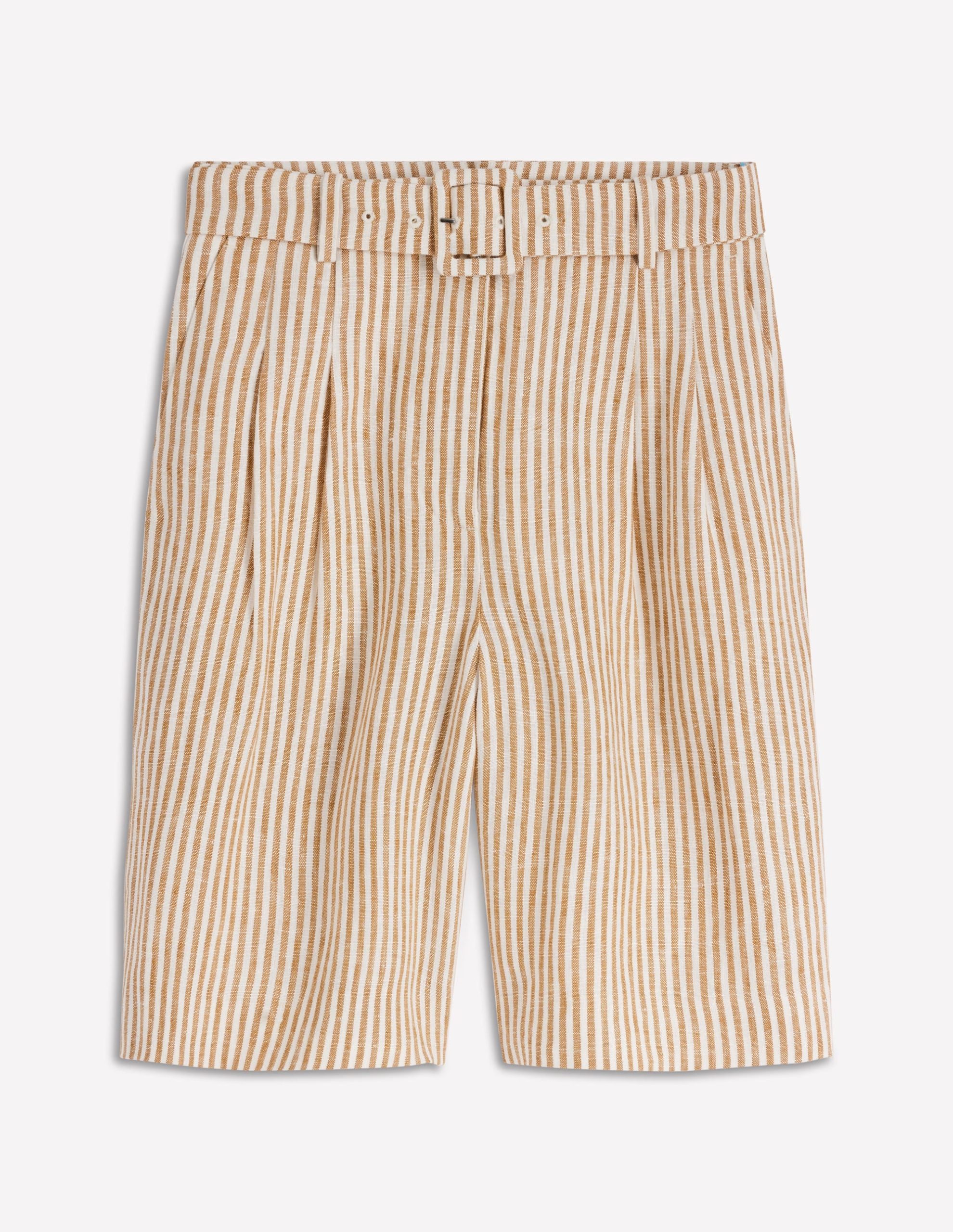 Chelsea Belted Linen Shorts-Brown. Ivory Ticking Stripe