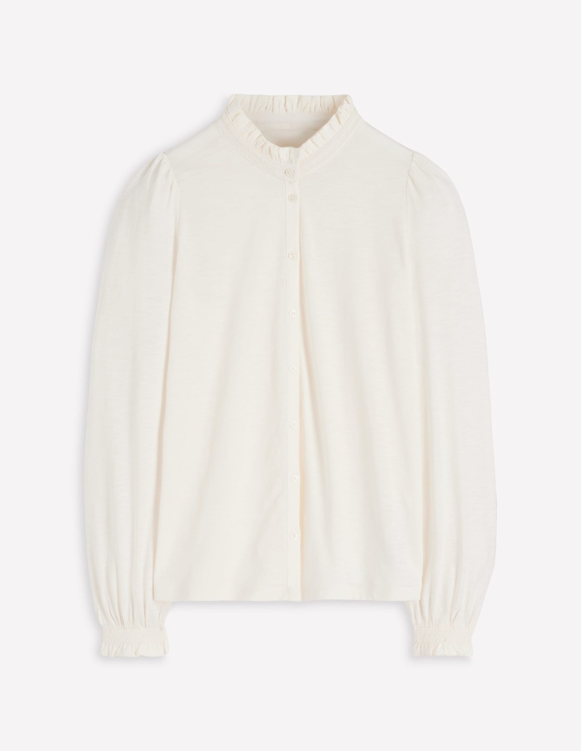 Reasons to love this smocked cotton-blend shirt? It’s incredibly easy to wear; goes with everything and the ruffled collar and cuffs are a chef’s kiss of a finishing touch.