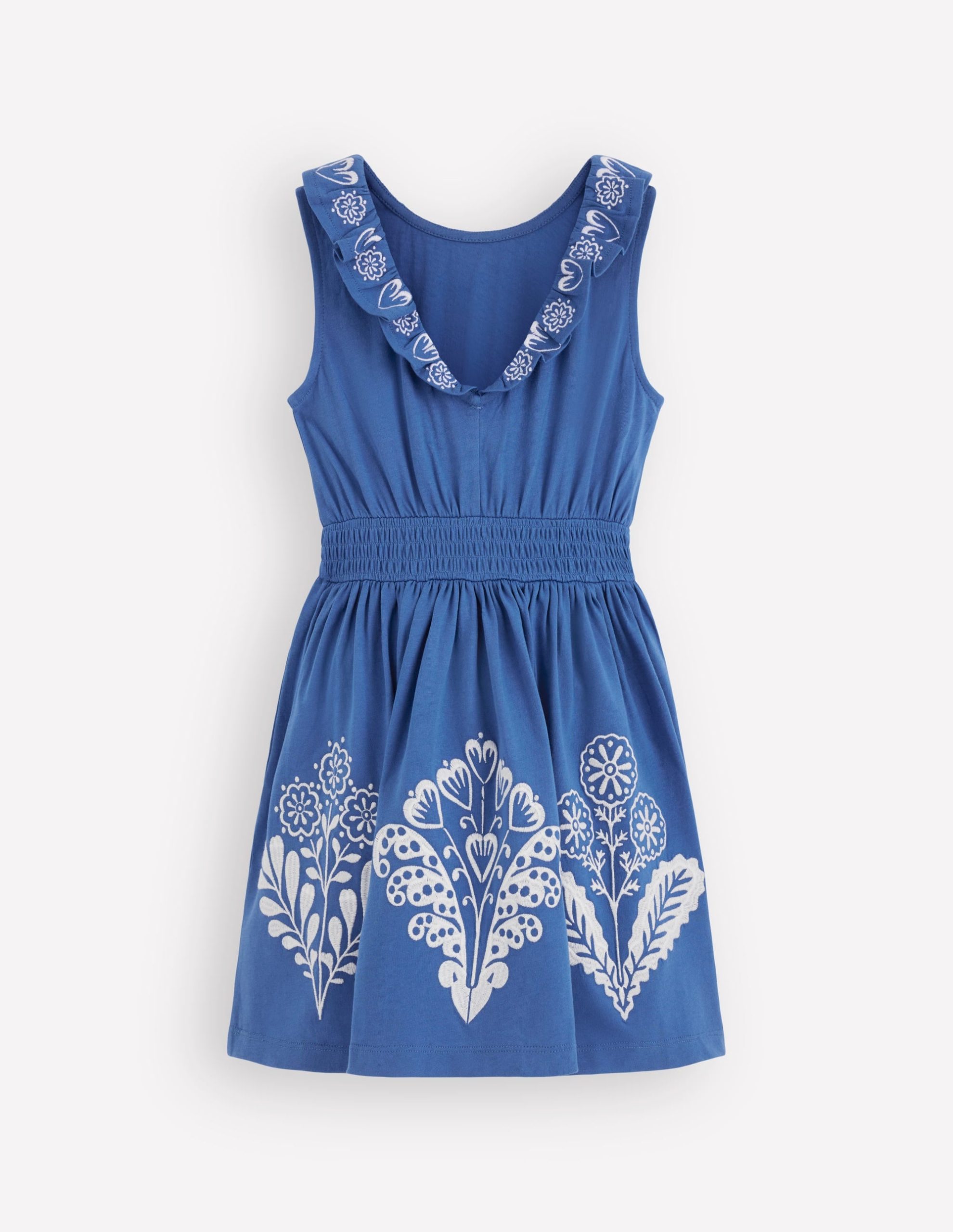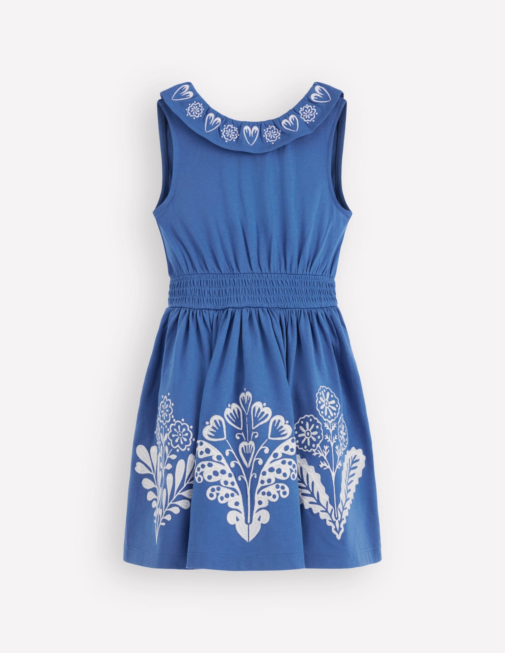 We poured a lot of love into this charming cotton dress. We hope it shows in the embroidery designs. the twirl-ready skirt and the frilly collar that flows down the back into a V-shape. The waist is stretchy for easy comfort and movement all day.