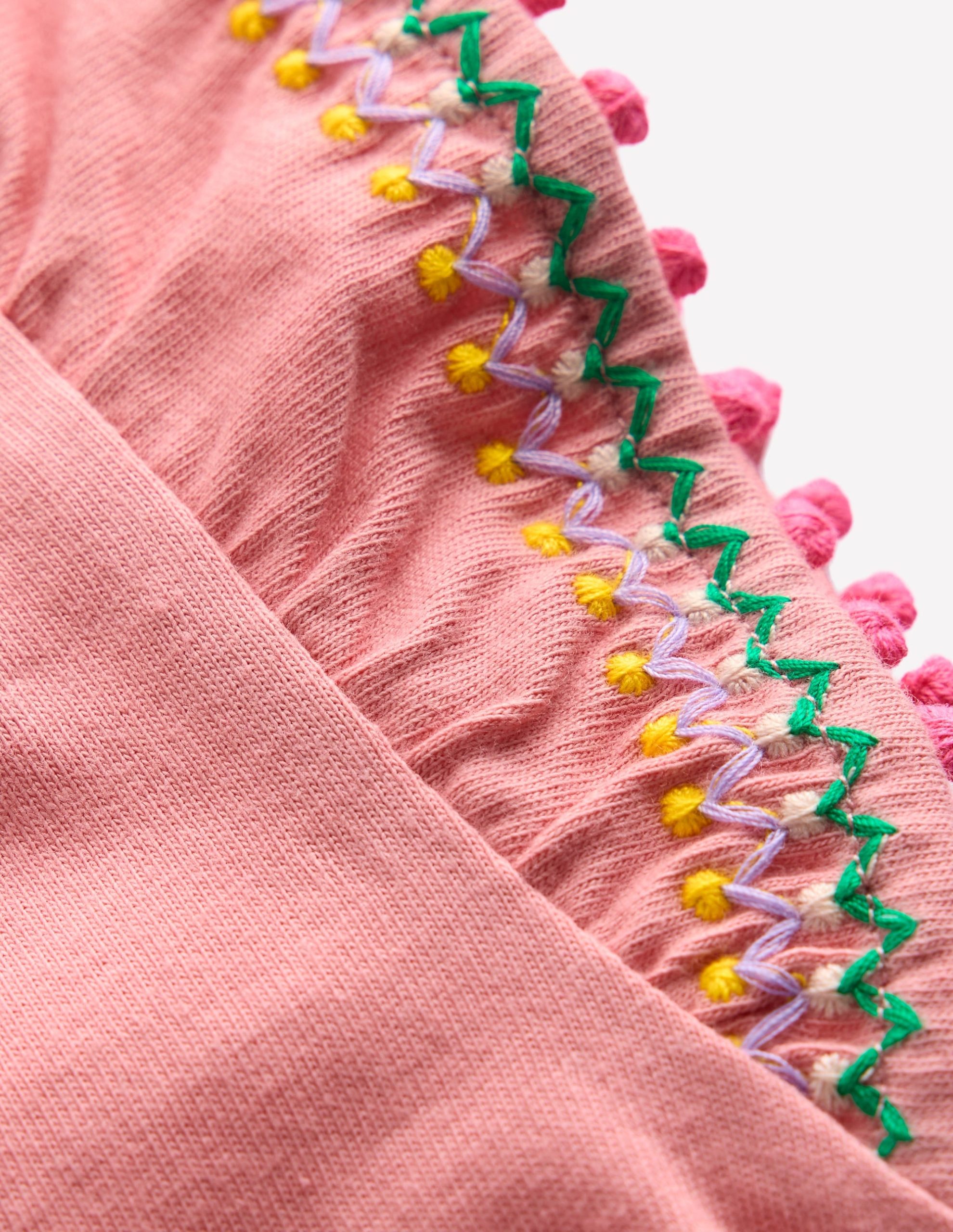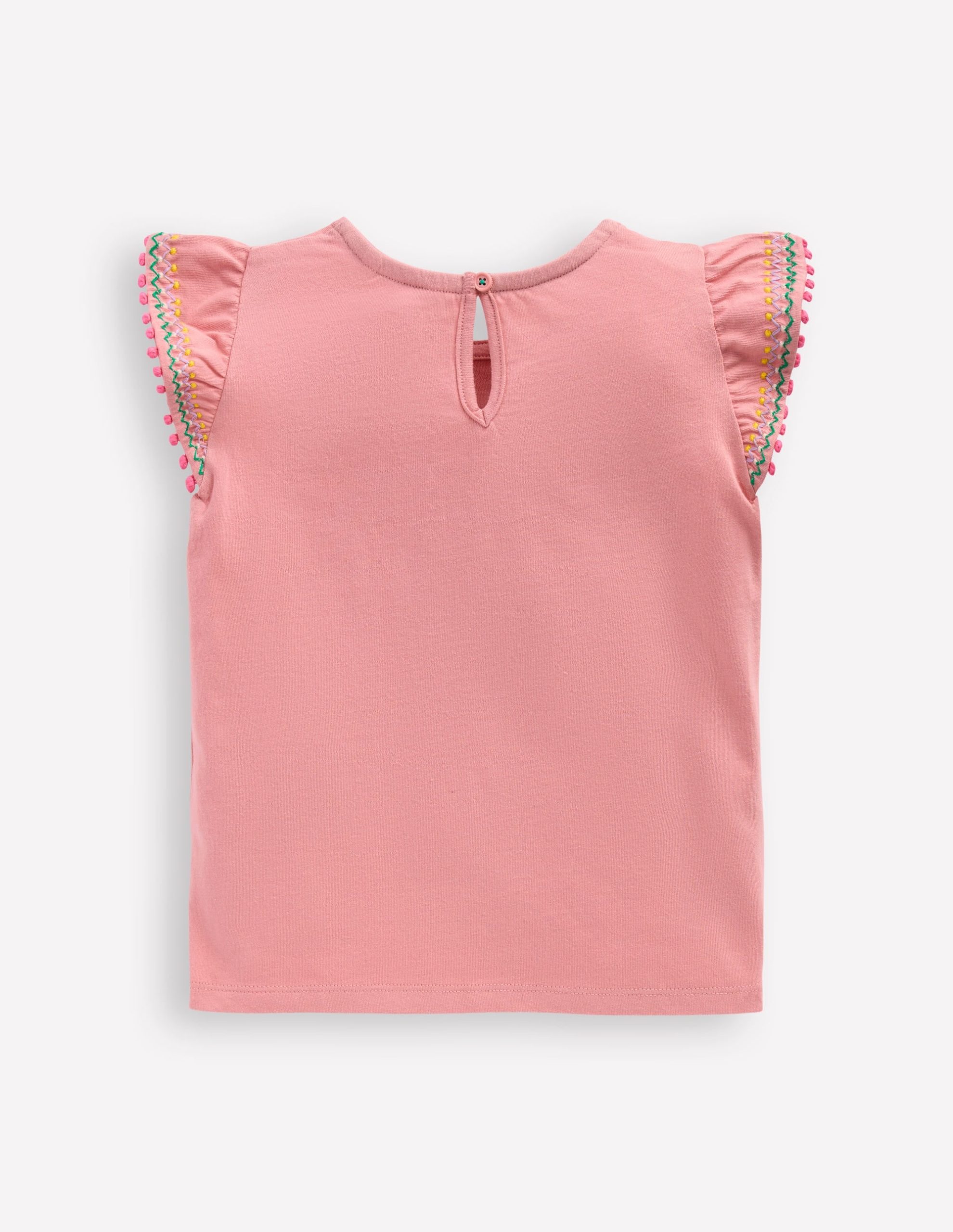 Everyday dressing just got that bit more fun for Minis with this soft cotton T-shirt. It has an embroidered pom trim on the fluttery sleeves and comes in a choice of bright colours.