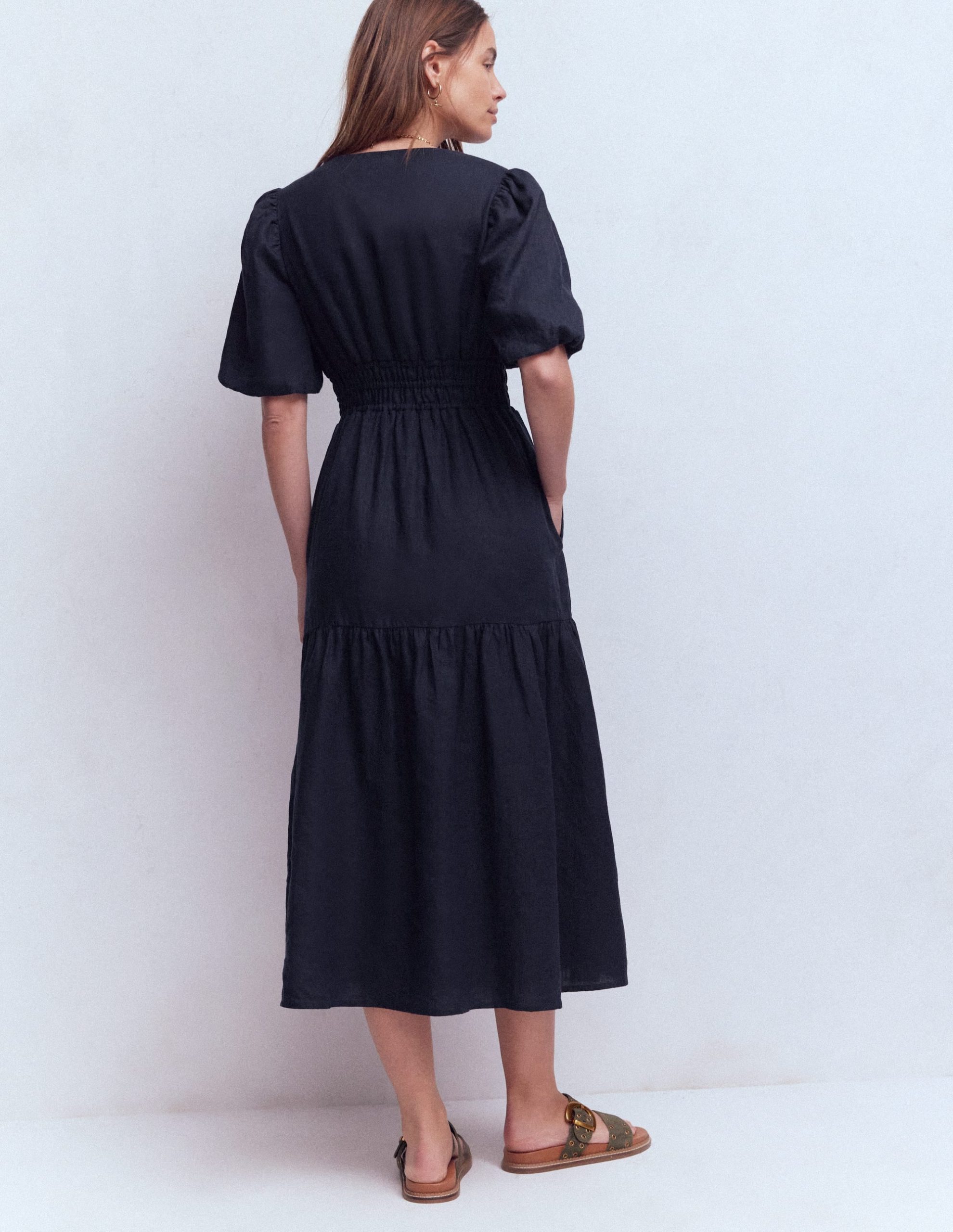 Set the tone for sunnier days ahead with this standout dress. It’s made from pure linen (with a cotton lining) and the billowy sleeves will get you noticed. The romantic shape features a fitted waist with soft gathers throughout. Pair with sandals and a chic bag for your next soirĂ©e.