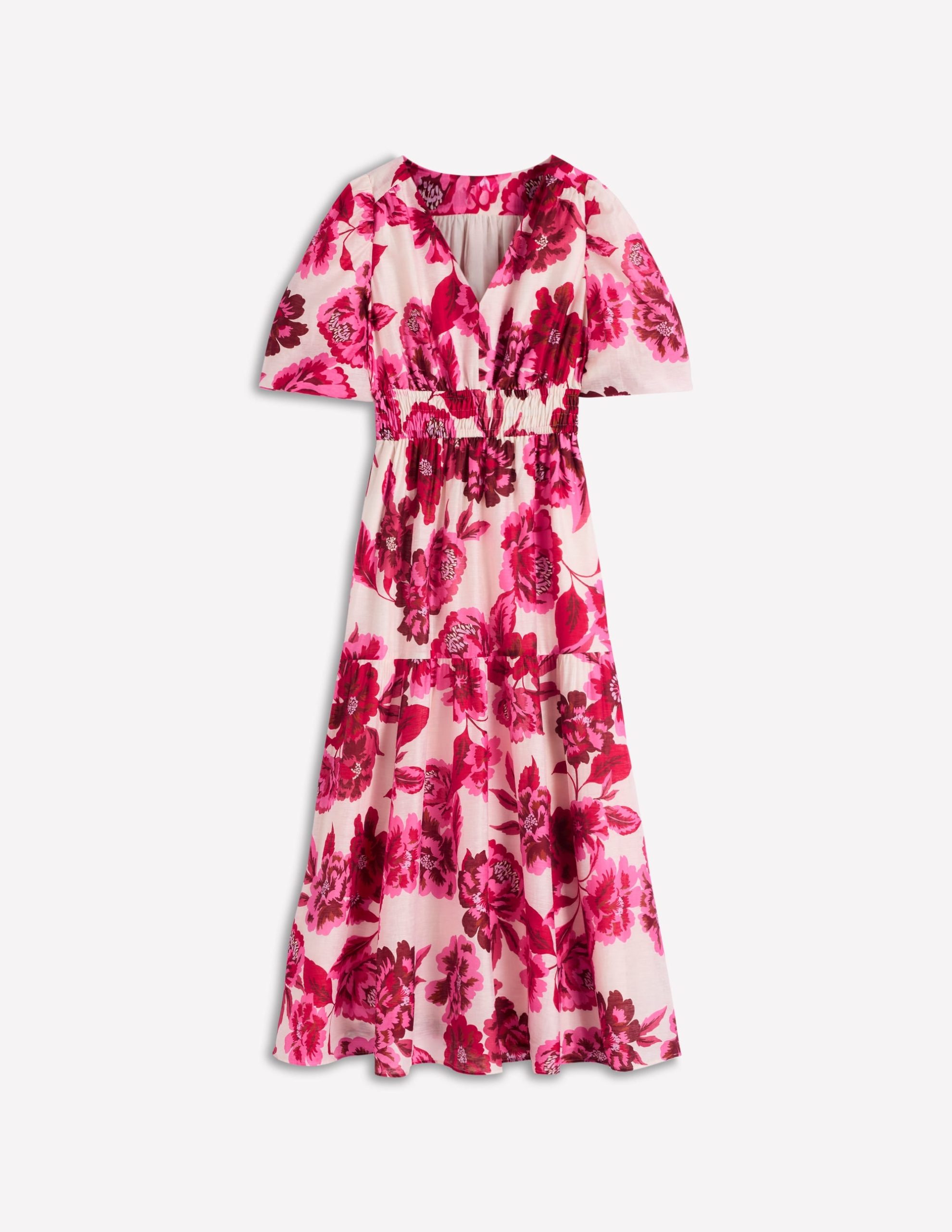 What could be better than a gorgeous dress that feels light and comfortable This V-neck style is the one. The airy blouson sleeves. elasticated waistband and floaty skirt make it a dream to wear. The bold floral print elevates it to show stopping. Add heels and you’re all set.