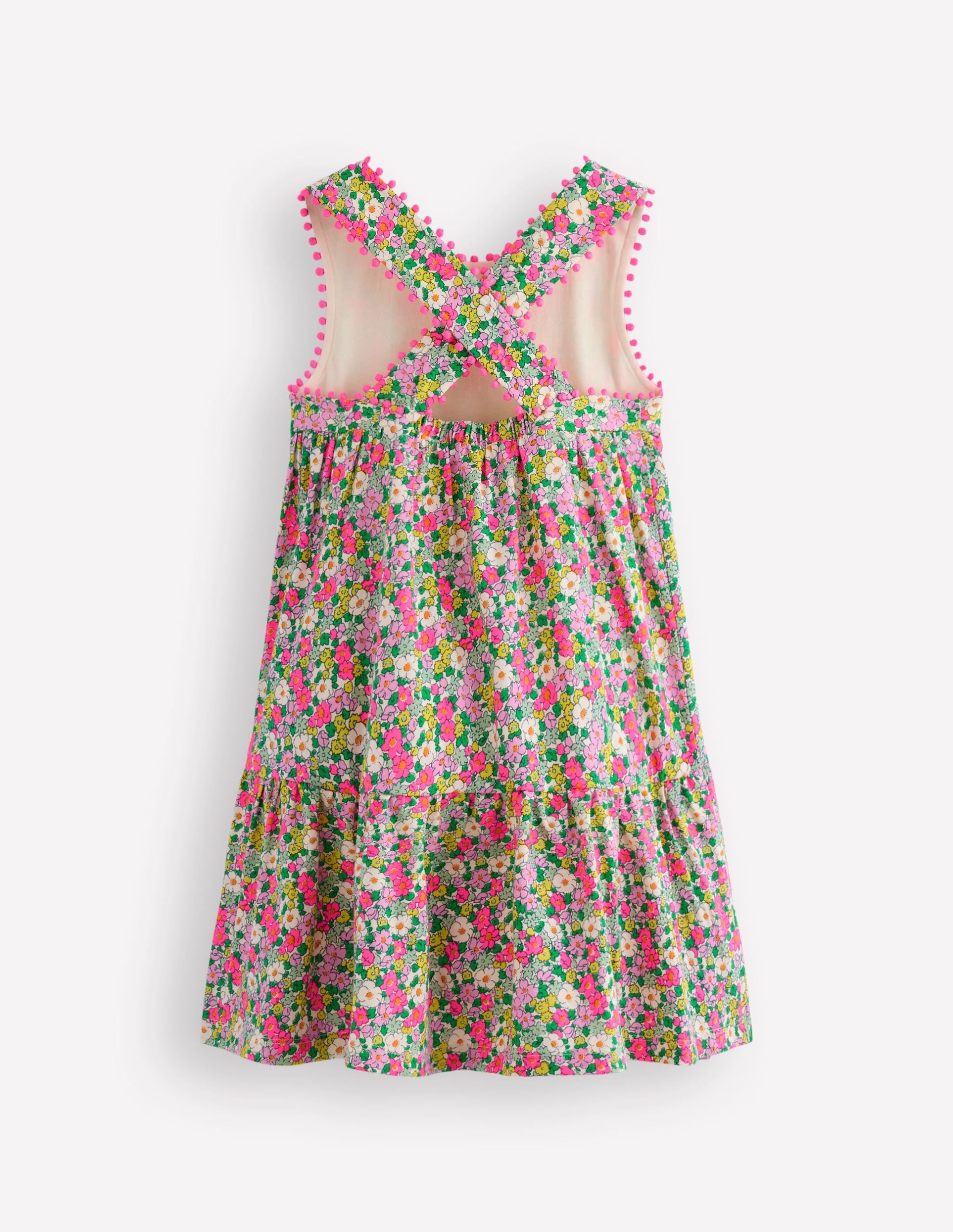 Summer fun starts with this adorable dress with its comfy jersey fabric and cross-back straps. Just look at those colourful teeny tiny pom poms.
