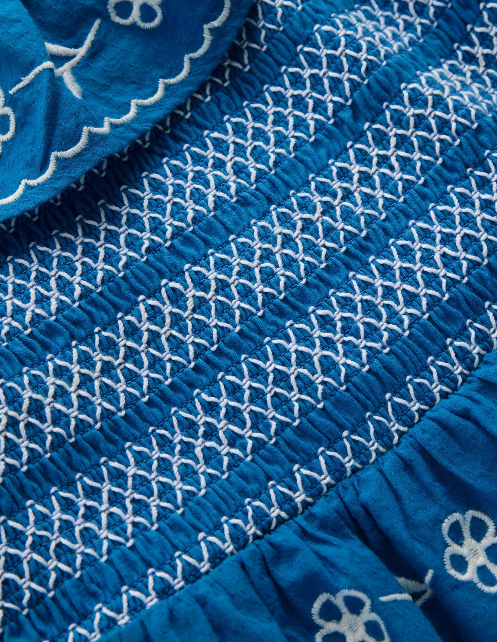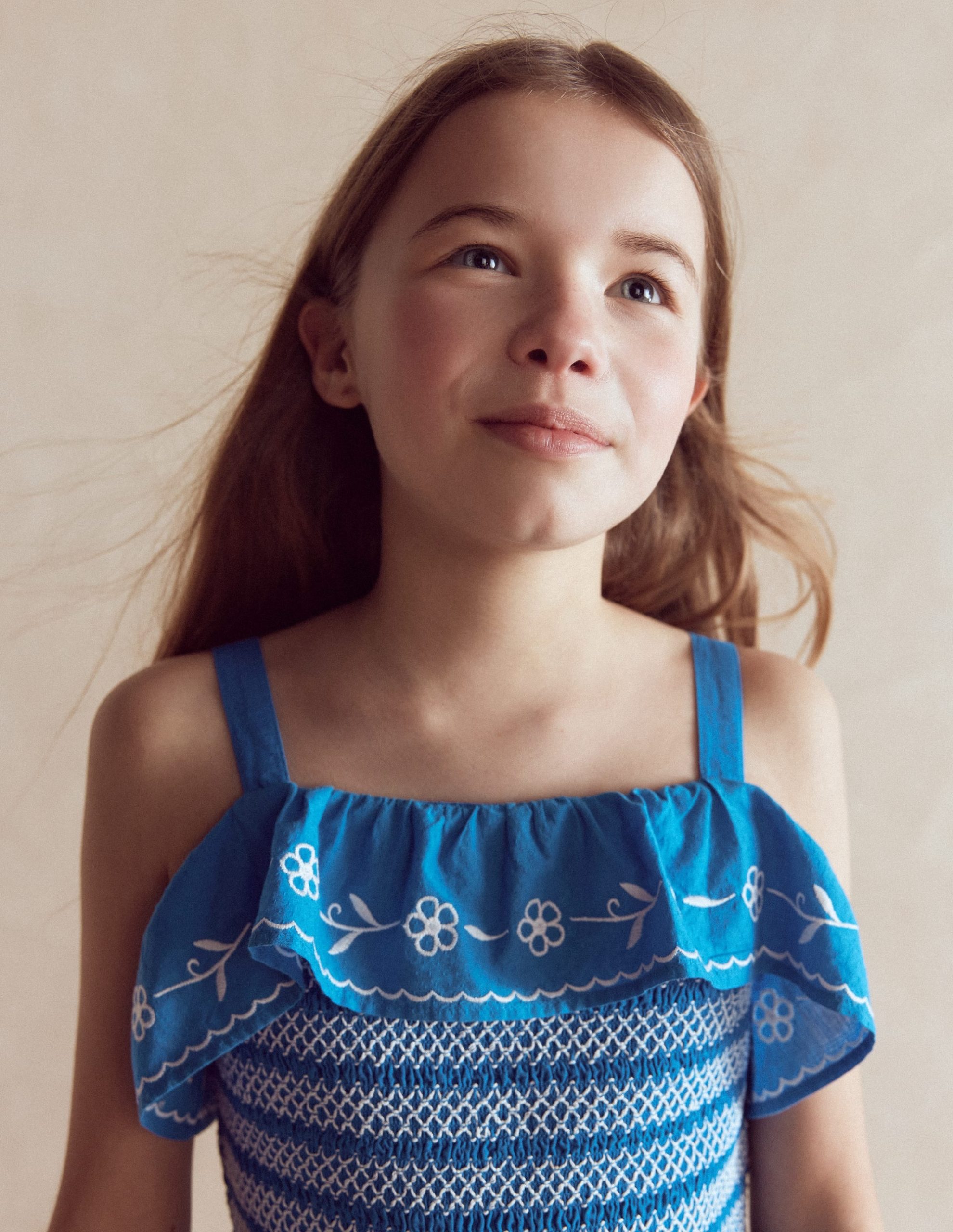 A midi dress that’ll make your Mini’s day. Spun from soft jersey cotton. the bodice is shirred for extra comfort and the tiers (we count six) will cause a kerfuffle: we’ve added embroidery and gathers to boost prettiness. volume and twirl-ability.