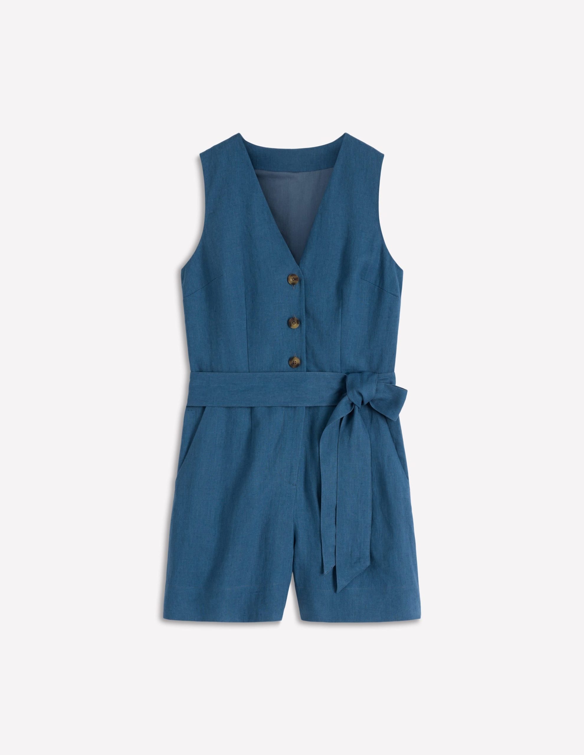 Proving a playsuit can look elevated. this tailored linen style will look great peeking out from under a blazer at work. Or wear it alone to show off the waistcoat-inspired clean lines. self-tie belt and wide-leg shorts (with pockets).