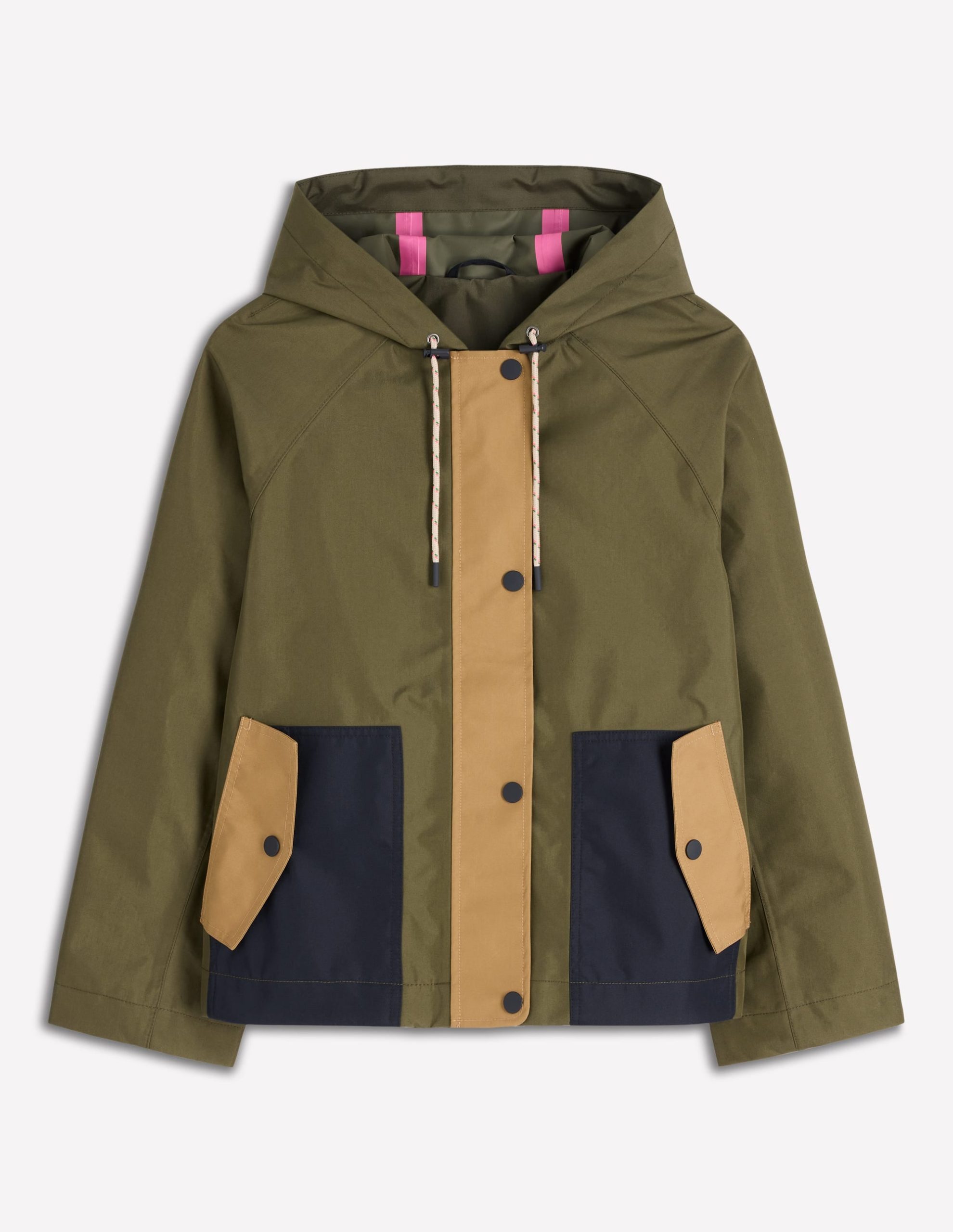 What’s essential in Britain when stepping outside to walk the dog or do the school dash? A trusty raincoat. This cropped style has secure pockets, a hood and a curved back hem.