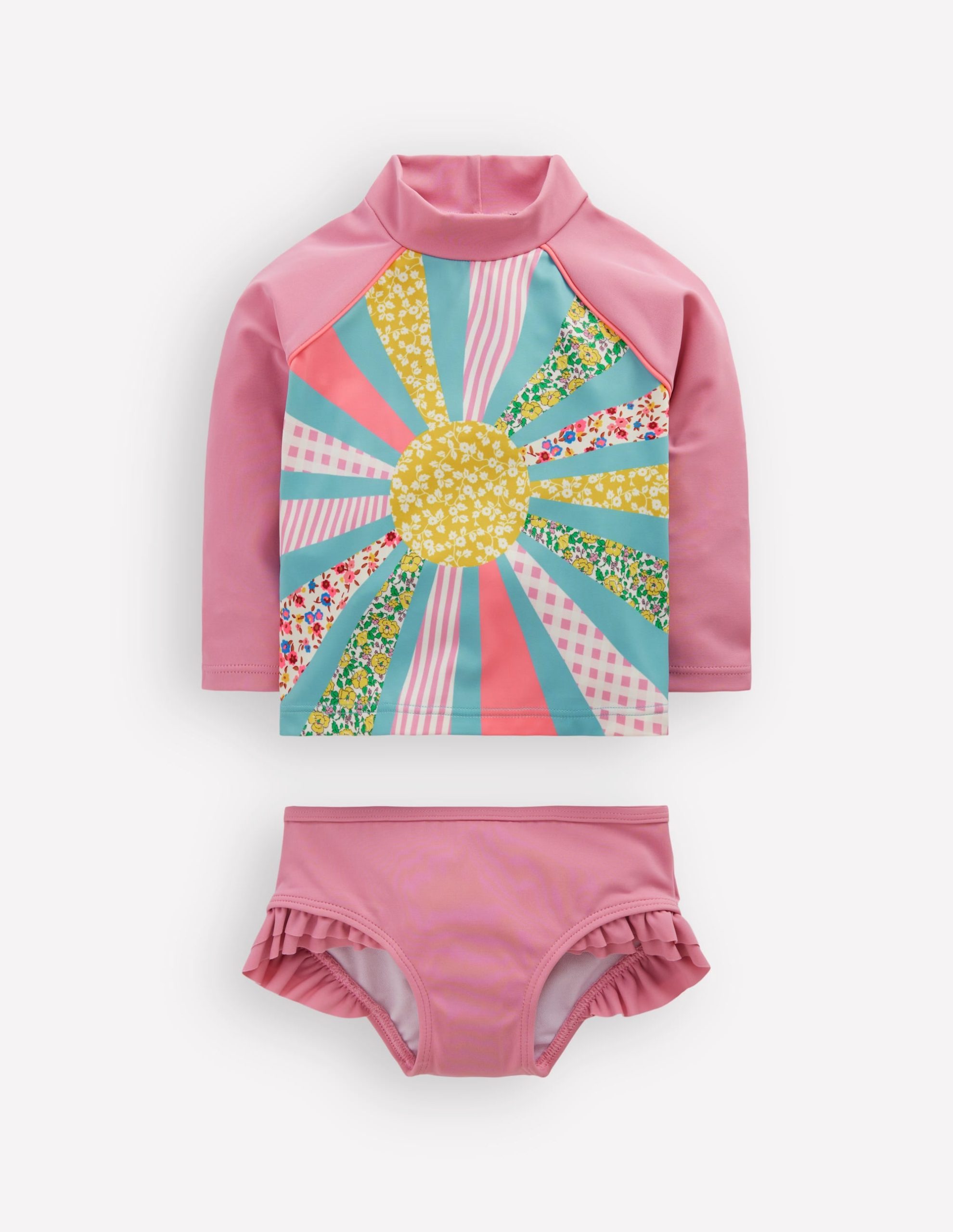 Everyone loves sunshine. especially when it’s made from ditsy flowers. stripes and checks. This sun-safe rash vest has long sleeves and a high neck for extra coverage. The matching bottoms are finished with sweet frills. All you need to add is the water and fun.