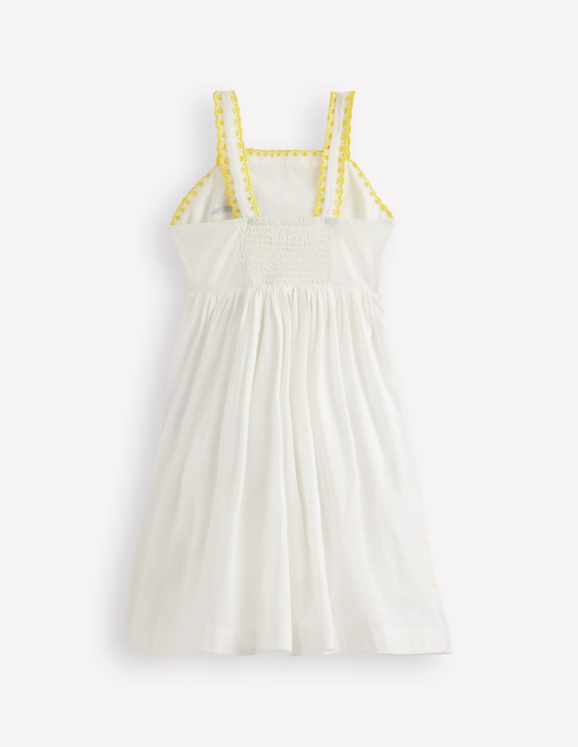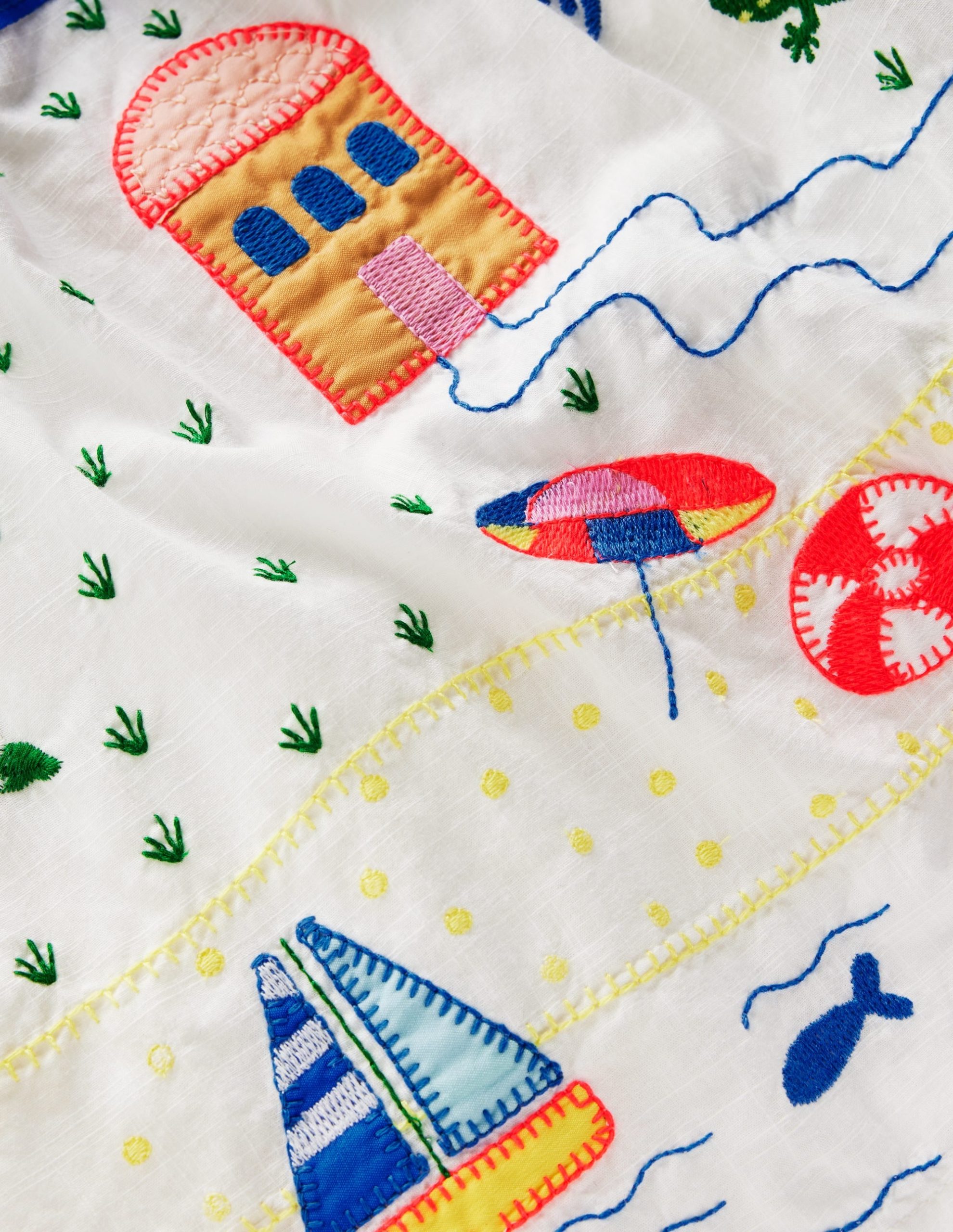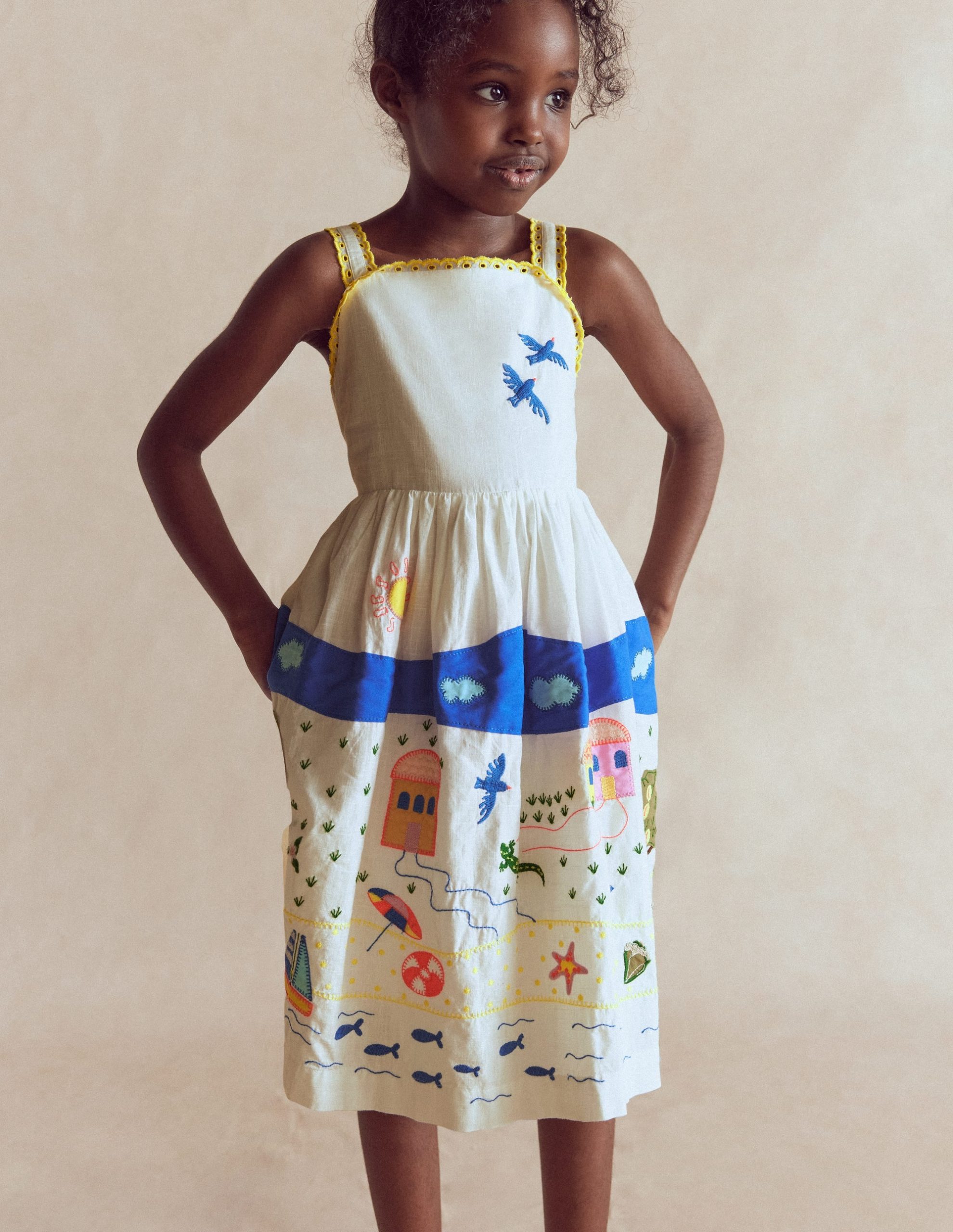 We’re calling it: this will be Mini’s sundress of the summer season (and many to come too). A joyful style. it’s crafted from 100% cotton with broderie trim straps and a comfy shirring back panel. The embroidery and fun holiday scenes give it the wow factor.