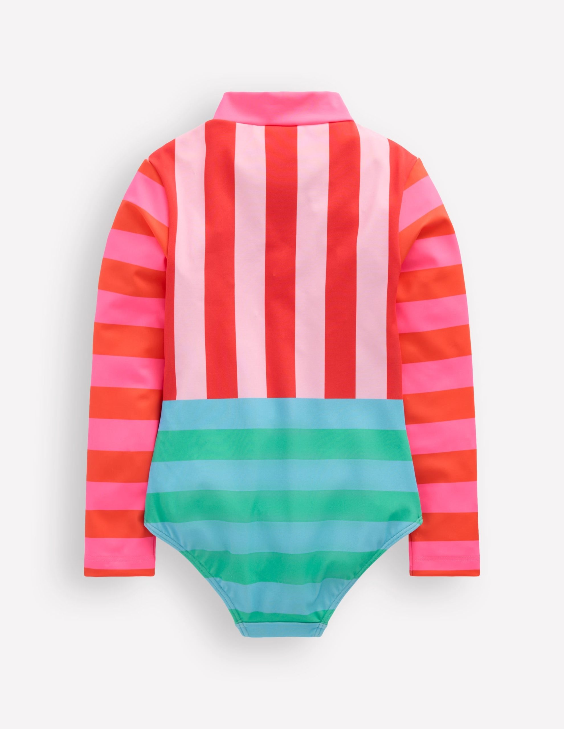 Decorated in bold winning stripes. this swimsuit is stitched with a zip to make changing a breeze and finished with long sleeves for extra coverage. Just add beach fun and a rubber ring.