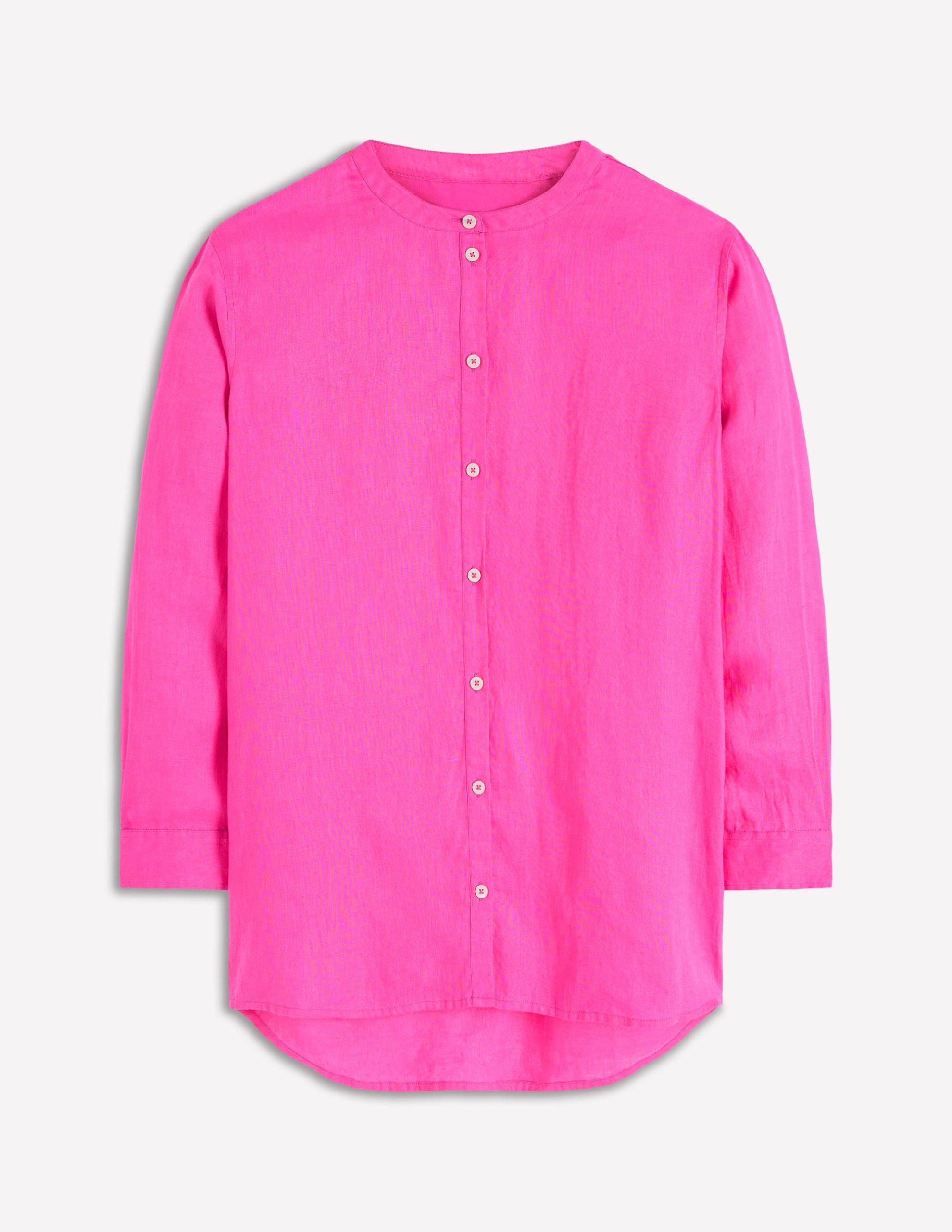A simple collar-free shirt that’s crafted from 100% linen and works as the perfect blank canvas to our party-ready tropical prints and bright colours. The longline shape gives it beach cover-up potential. too.