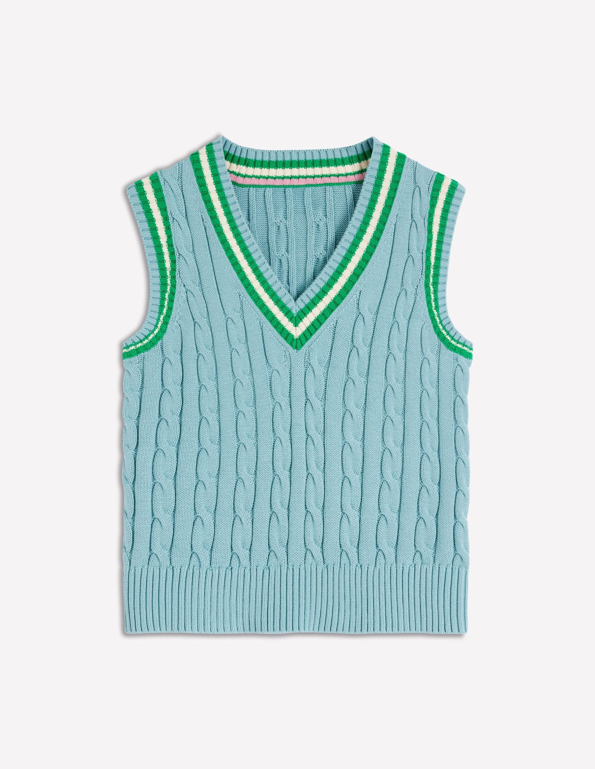 Meet Maeve: a lightweight V-neck cotton tank with a cable knit design. contrast colours and a fitted silhouette. The perfect preppy spring layer paired with jeans or linen trousers (we do both).