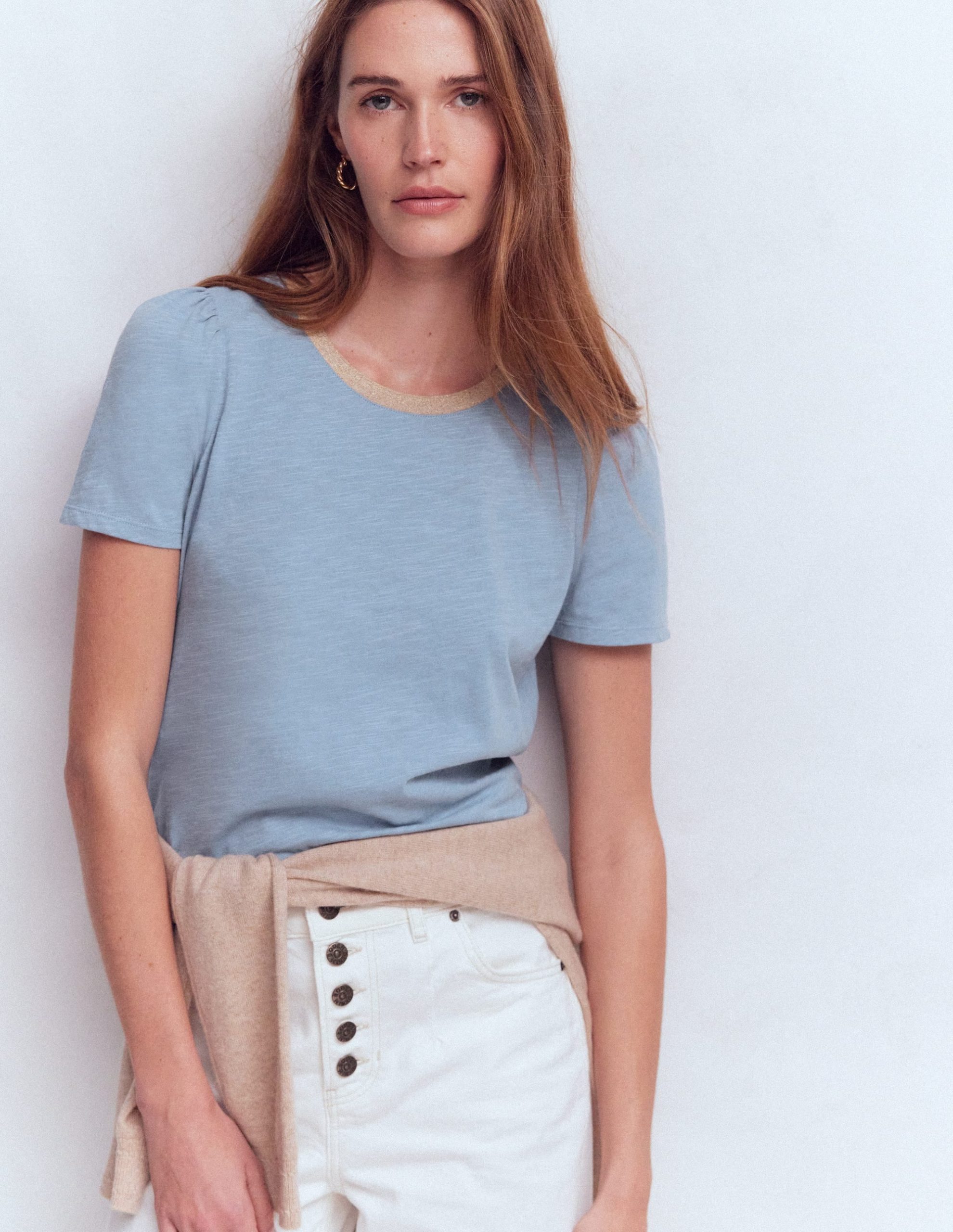 T-shirt season is fast approaching. This elevated design features a metallic trim, slightly puffed sleeves and comes in a variety of rich colours. Wear with jeans or tucked into a leather skirt.
