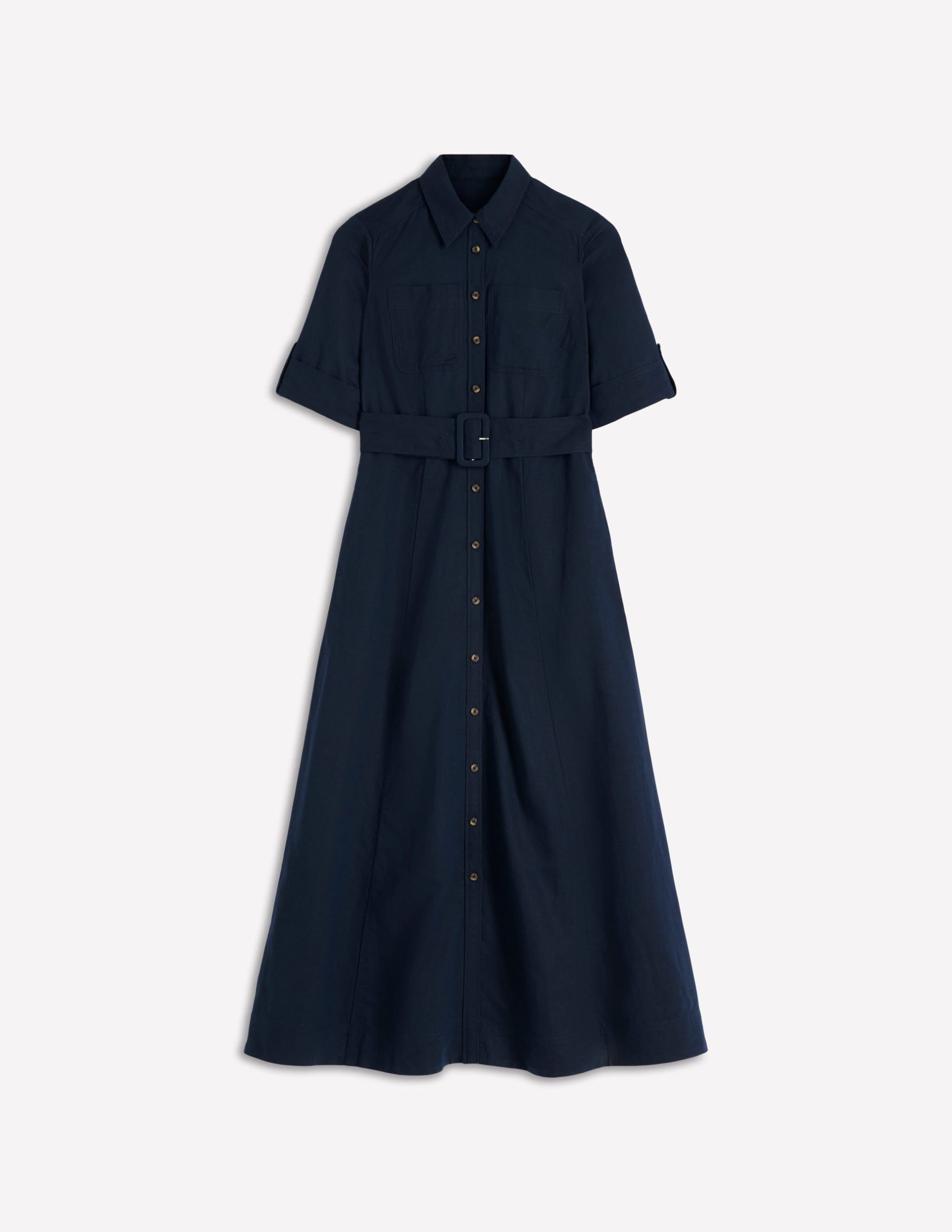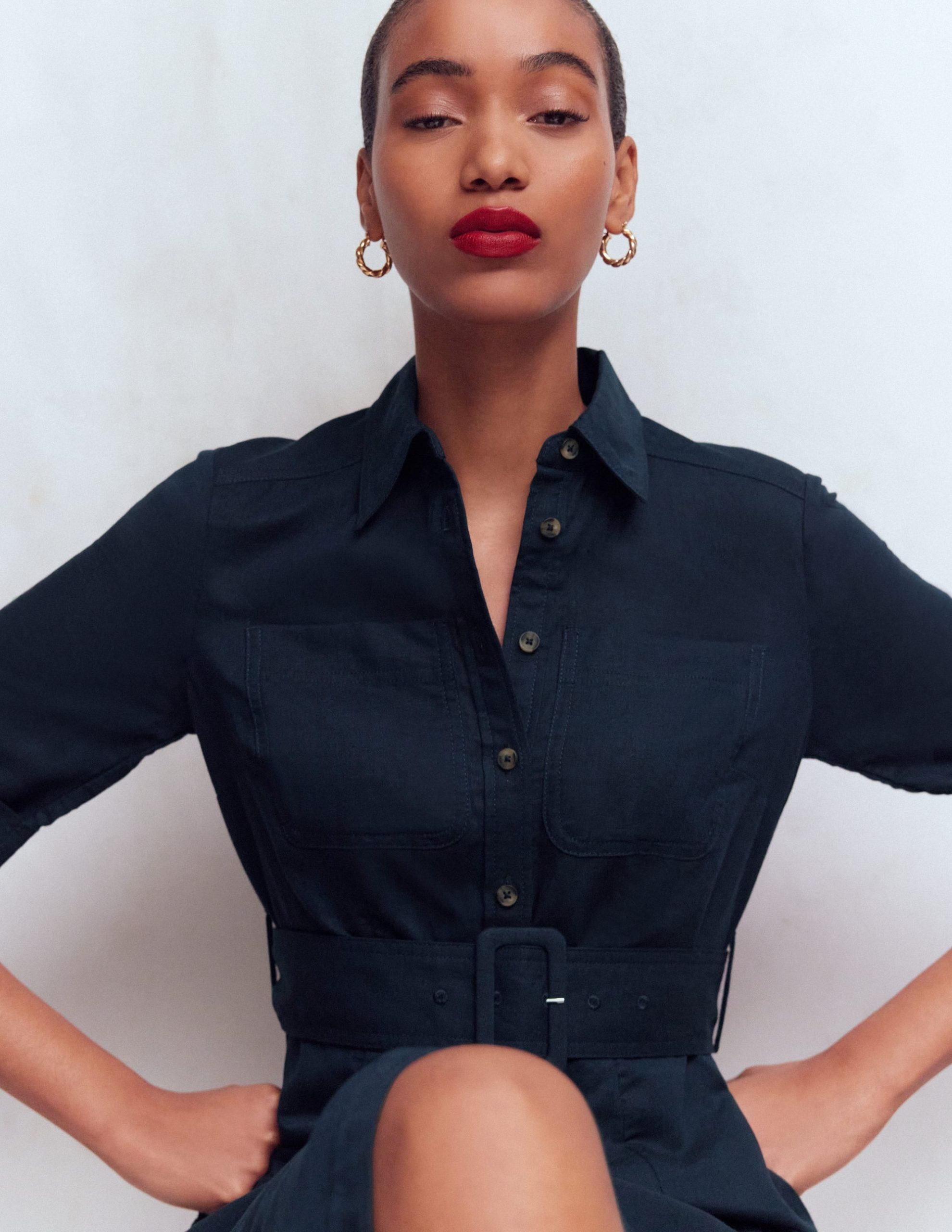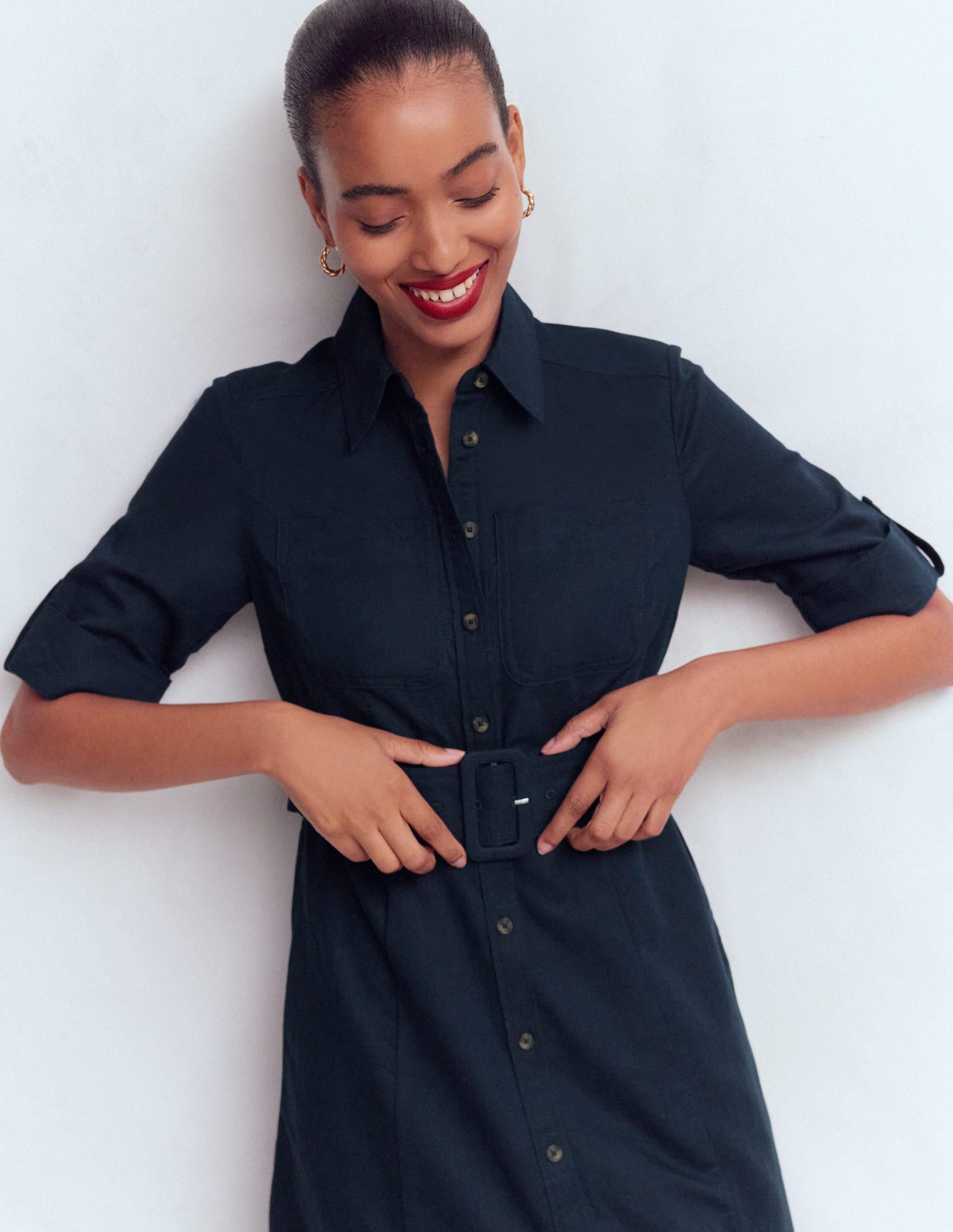 This heatwave defying shirt-dress is a workwear solution on hot days. Crafted from a cotton linen blend with a classic collar and built-in belt. the roll up short sleeves and chest pockets give it a subtle utilitarian edge. Choose from neutral shades. bold colours and vertical stripes.