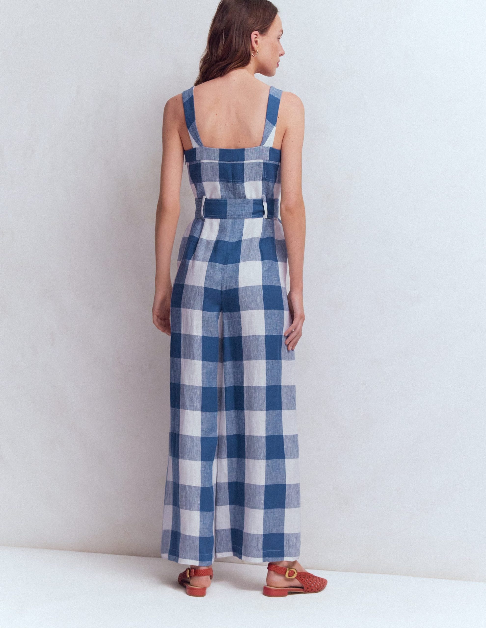 Panelled Bodice Linen Jumpsuit-Denim Blue Gingham