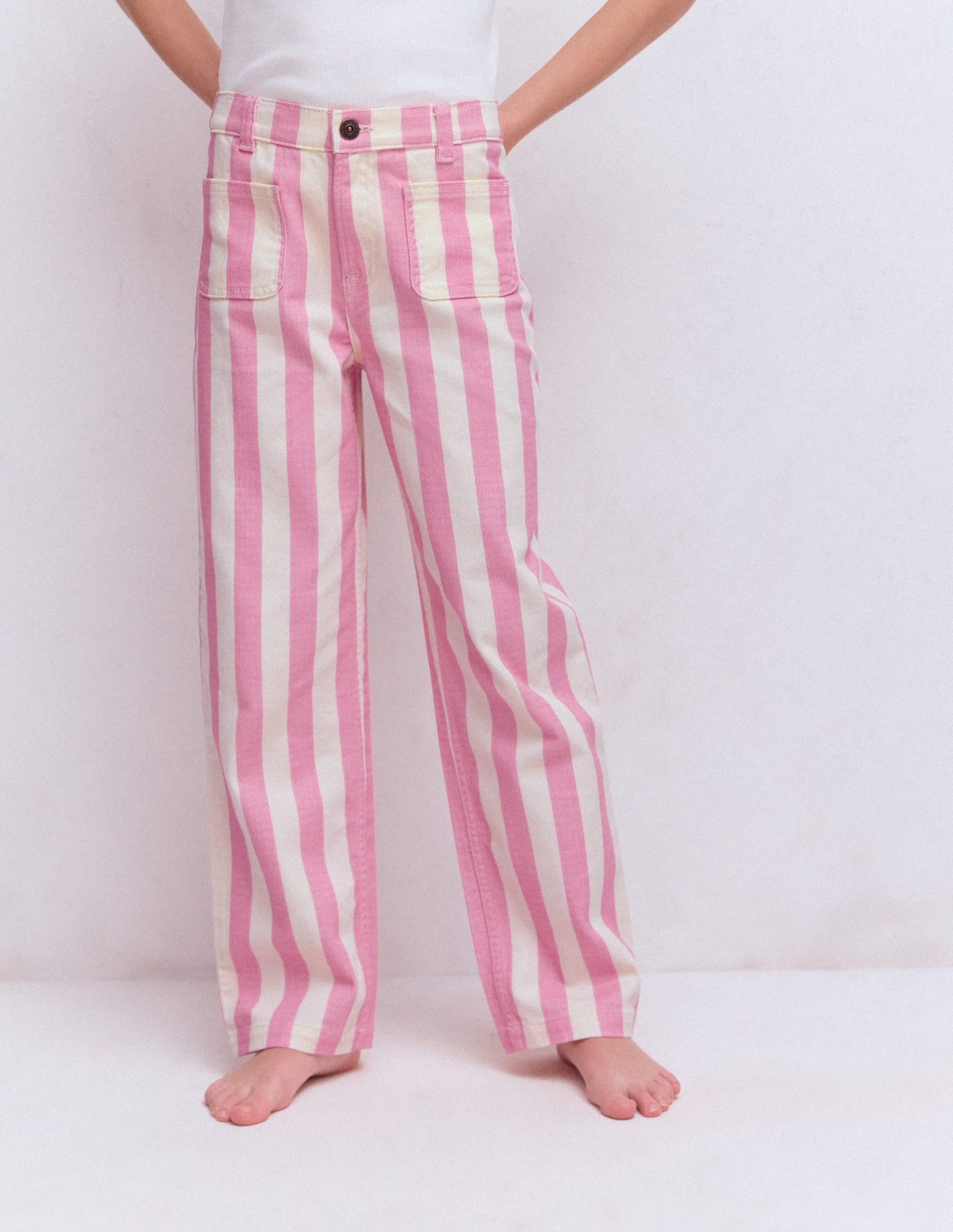 With a wide-leg shape and patch pockets (4 of them in total), these jeans are a favourite in the making. Choose between solid green or colourful stripes (complete with our matching jacket).