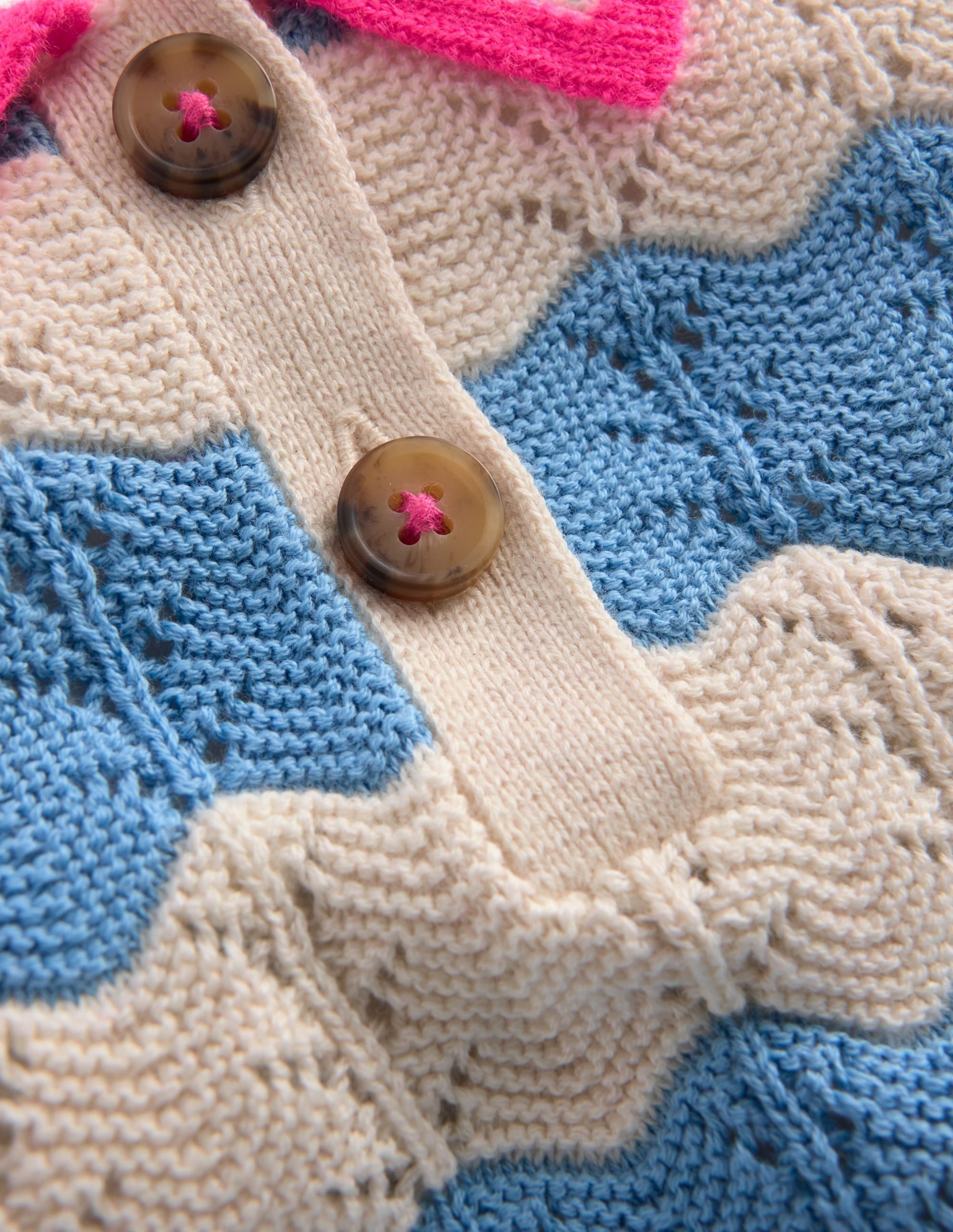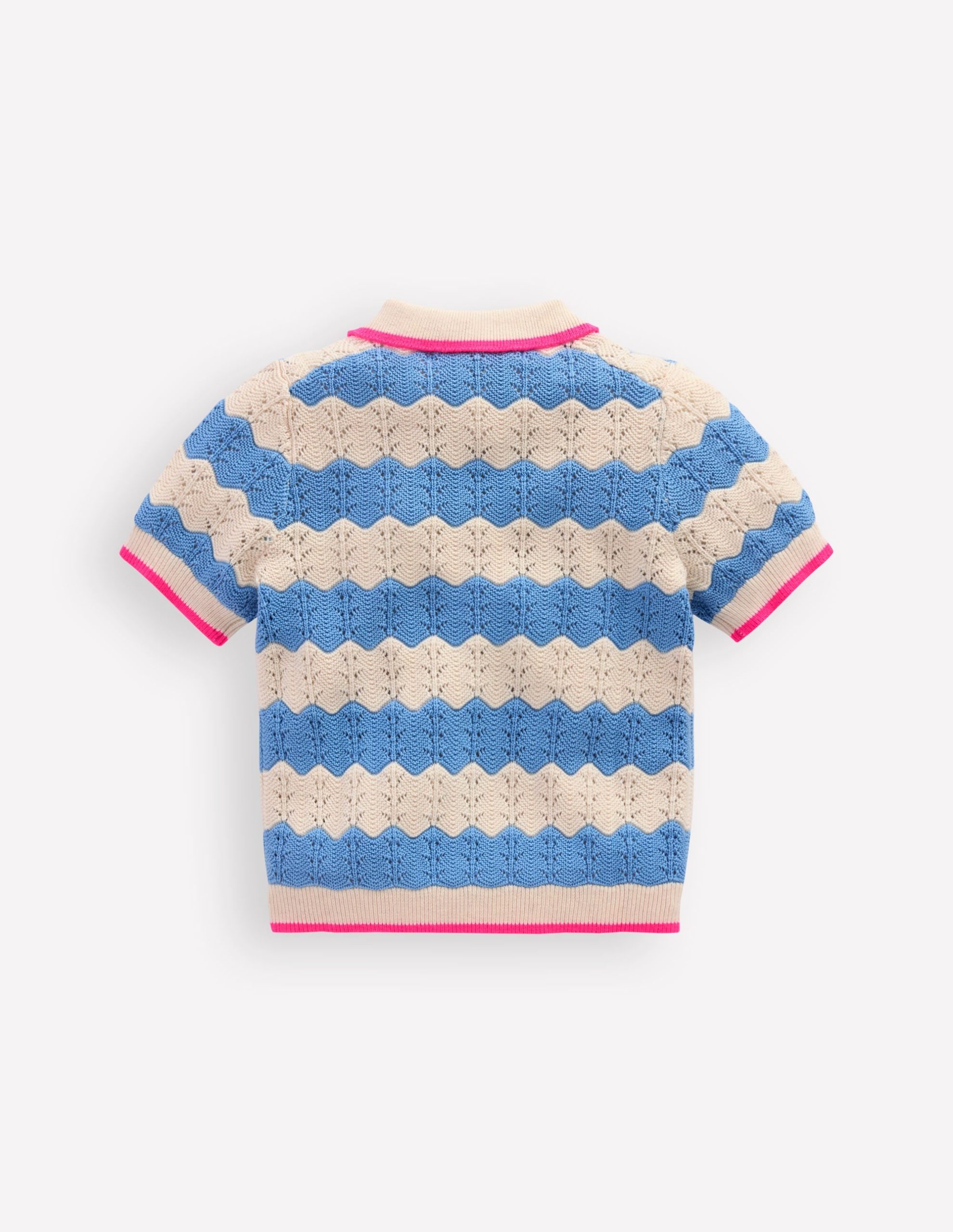 A polo top with a twist. A very colourful wavy twist. Knitted from soft cotton. this top has a rainbow chevron pattern. It looks adorable with a pair of jeans now and even more so with the matching shorts in summer.