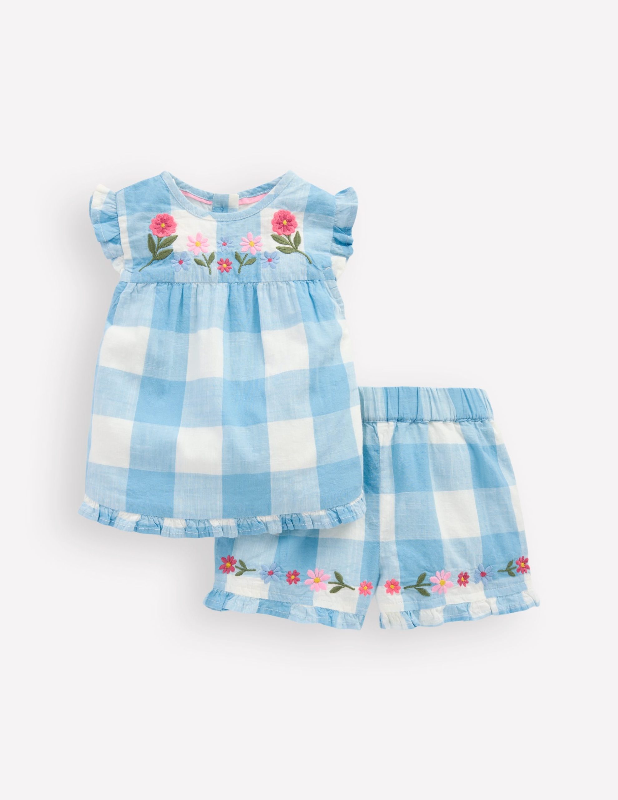 Pretty and practical. this colourful playset is crafted from 100% cotton with curved hems (like a built in bib) and shorts to keep Minis cool. You’ll love the frills and embroidery.