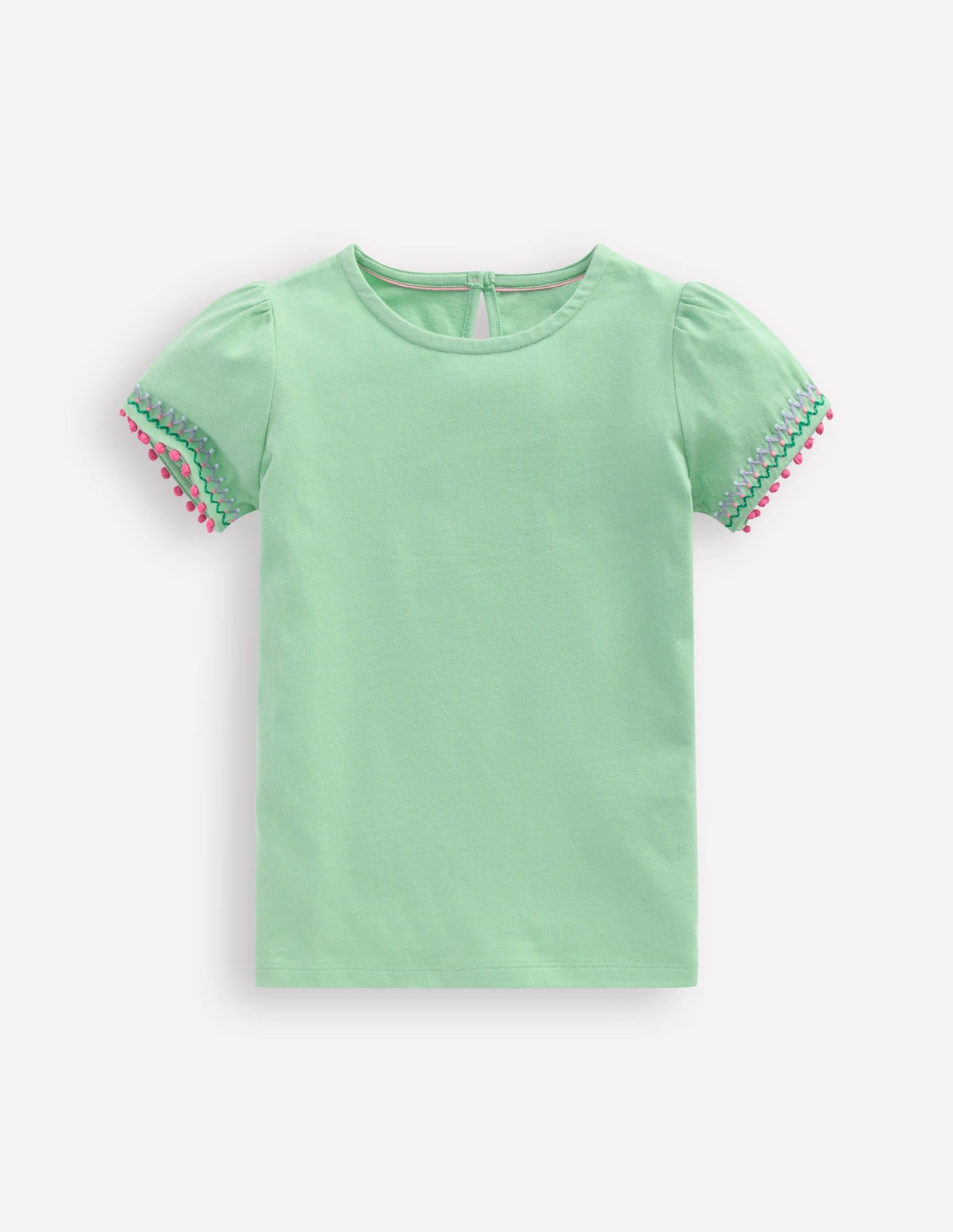 Little eyes never miss a detail. So we added puff sleeves and colourful embroidery with tiny pom pom trim to this soft 100% cotton T-shirt. Layer under a pair of dungarees to really show off those sleeves.