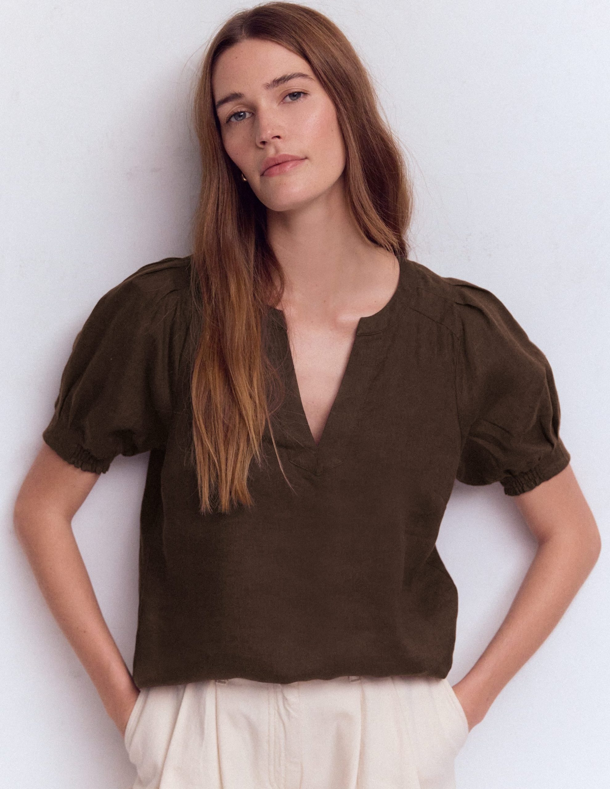 Why is this pure linen top a dream wardrobe must-have For so many reasons. The box pleats add volume in all the right places. the subtle V-neck shows off necklaces and the cuffs are elasticated (at the back) for comfort. It also feels soft on your skin. And it will go with everything.