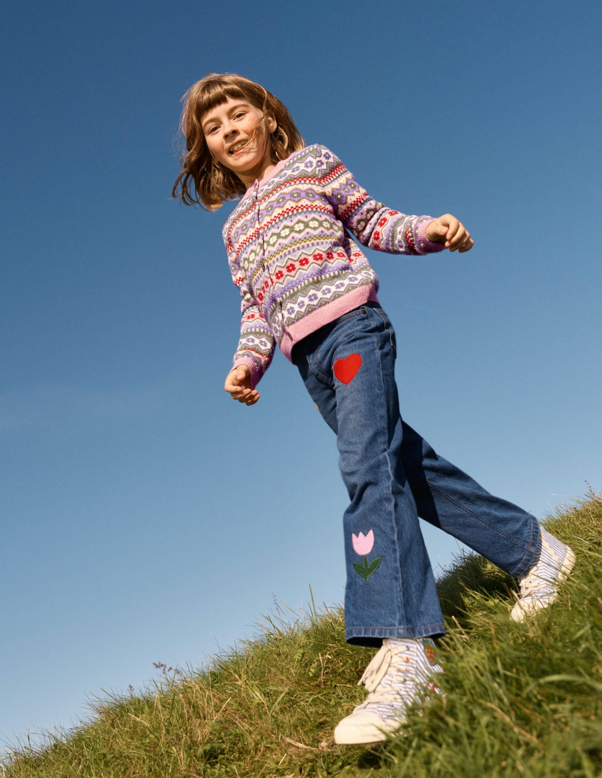 These jeans have a relaxed, looser shape, so they’re nice and comfy for everyday outfits. Choose from plain denim, colourful appliqués or stripes. We love them worn with the cuffs turned up.