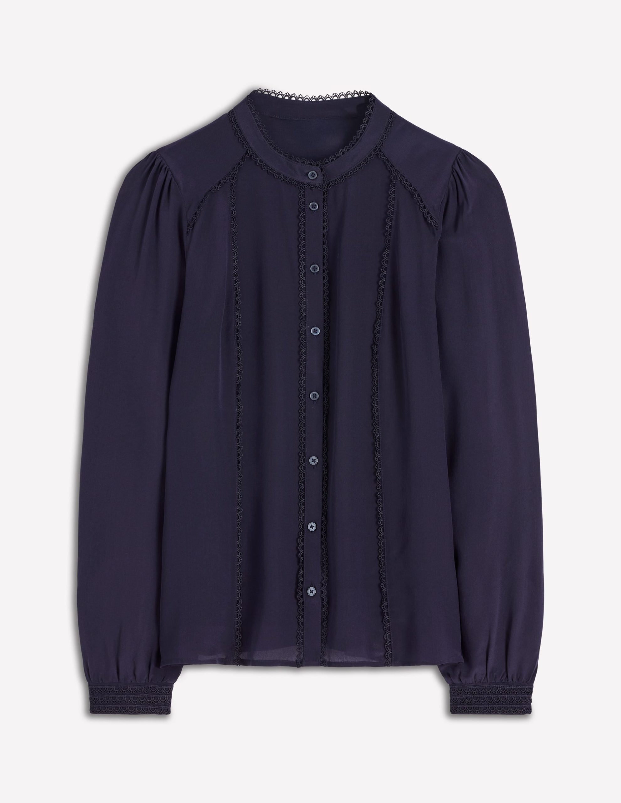 Your hard-working wardrobe deserves a little luxury. Rhea delivers as a 100% silk top with a delicate embroidered trim and simple collarless cut. Choose from a variety of colours and prints. It’ll go with everything and feel soft on your skin.