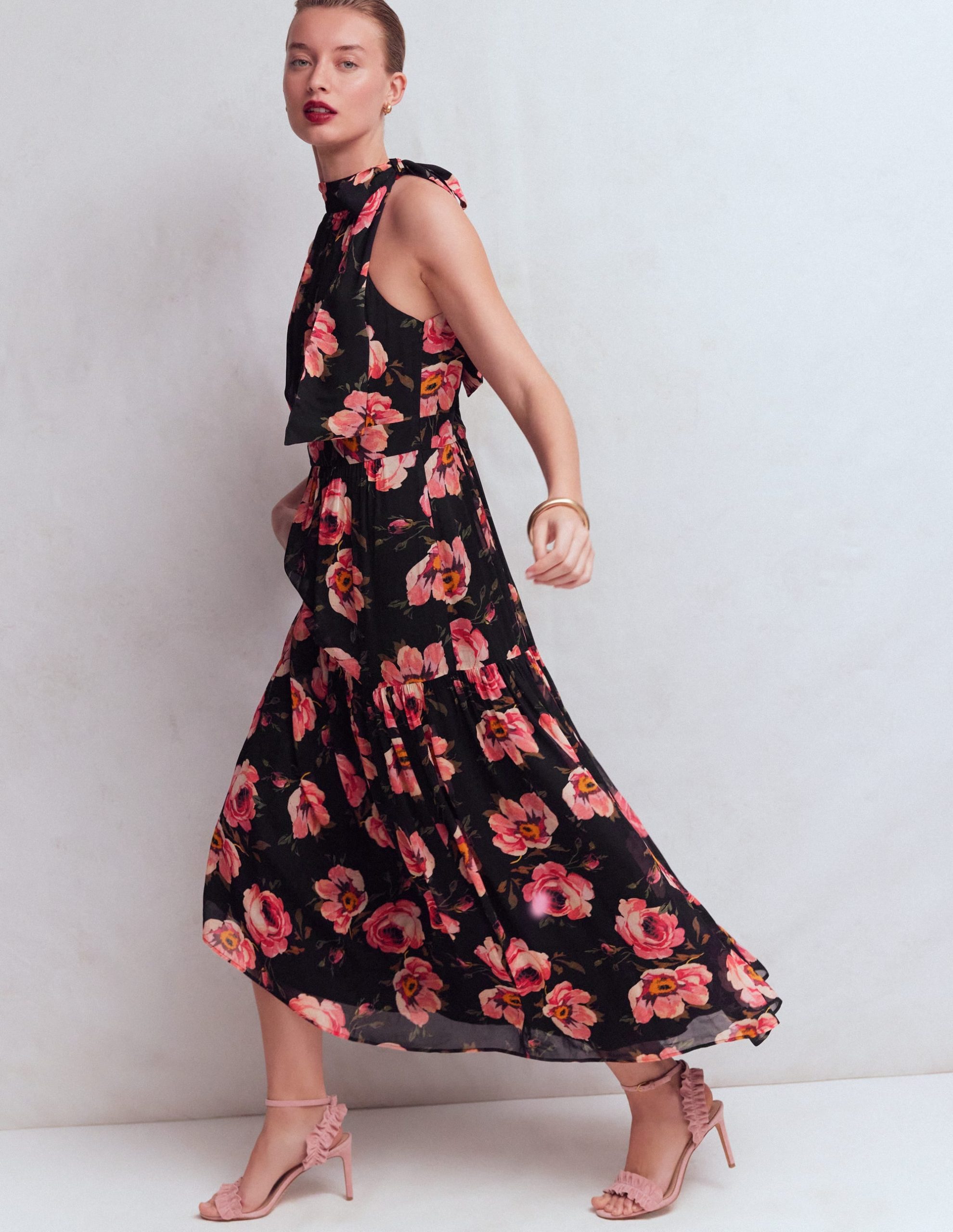 Roisin Tie Neck Maxi Dress-Black Whimsical Roses