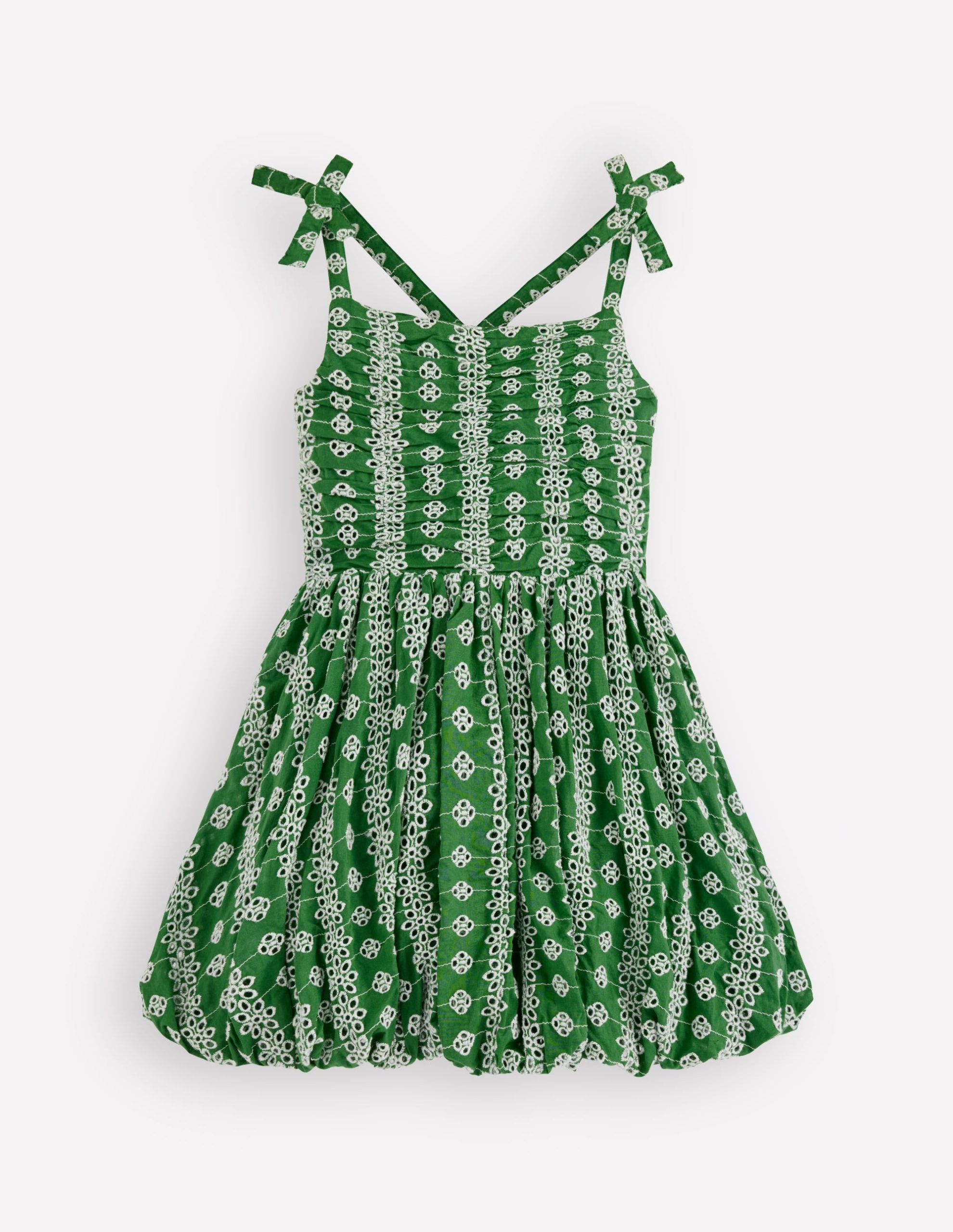 Minis love to blow bubbles. We designed a delightful dress so they can wear one too. The bodice is ruched with bow straps that cross at the back. Soft gathers create a skirt with lots of fun volume. As for the prints Try stripes. broderie and flowers.