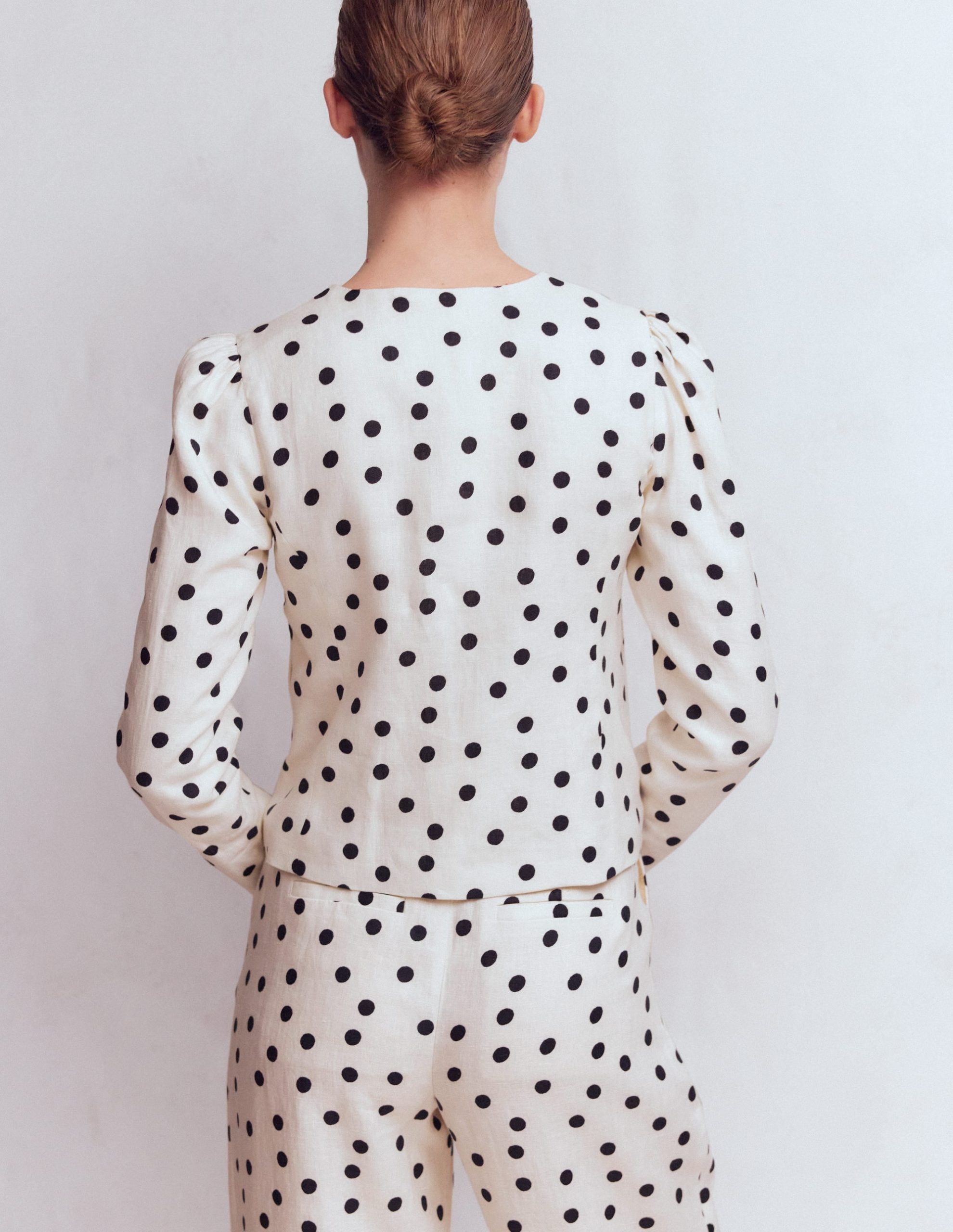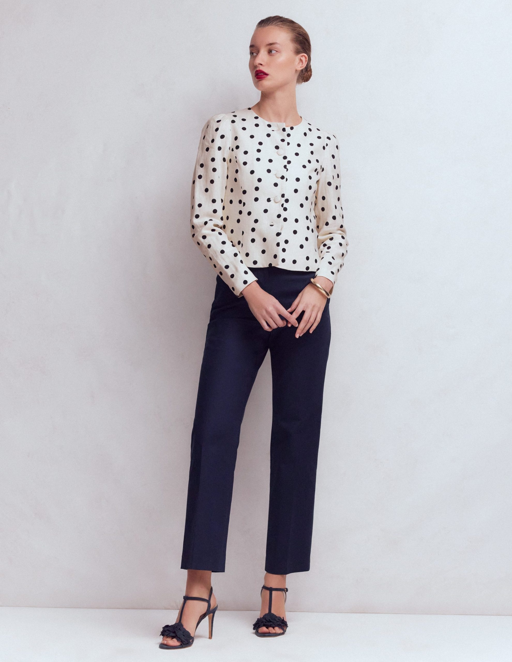 The beauty of our Salisbury jacket lies in its gently puffed sleeves. fabric covered buttons and glorious prints. Wear it to dress up your favourite jeans or pair it with the matching linen trousers for instant day-at-the-races energy.