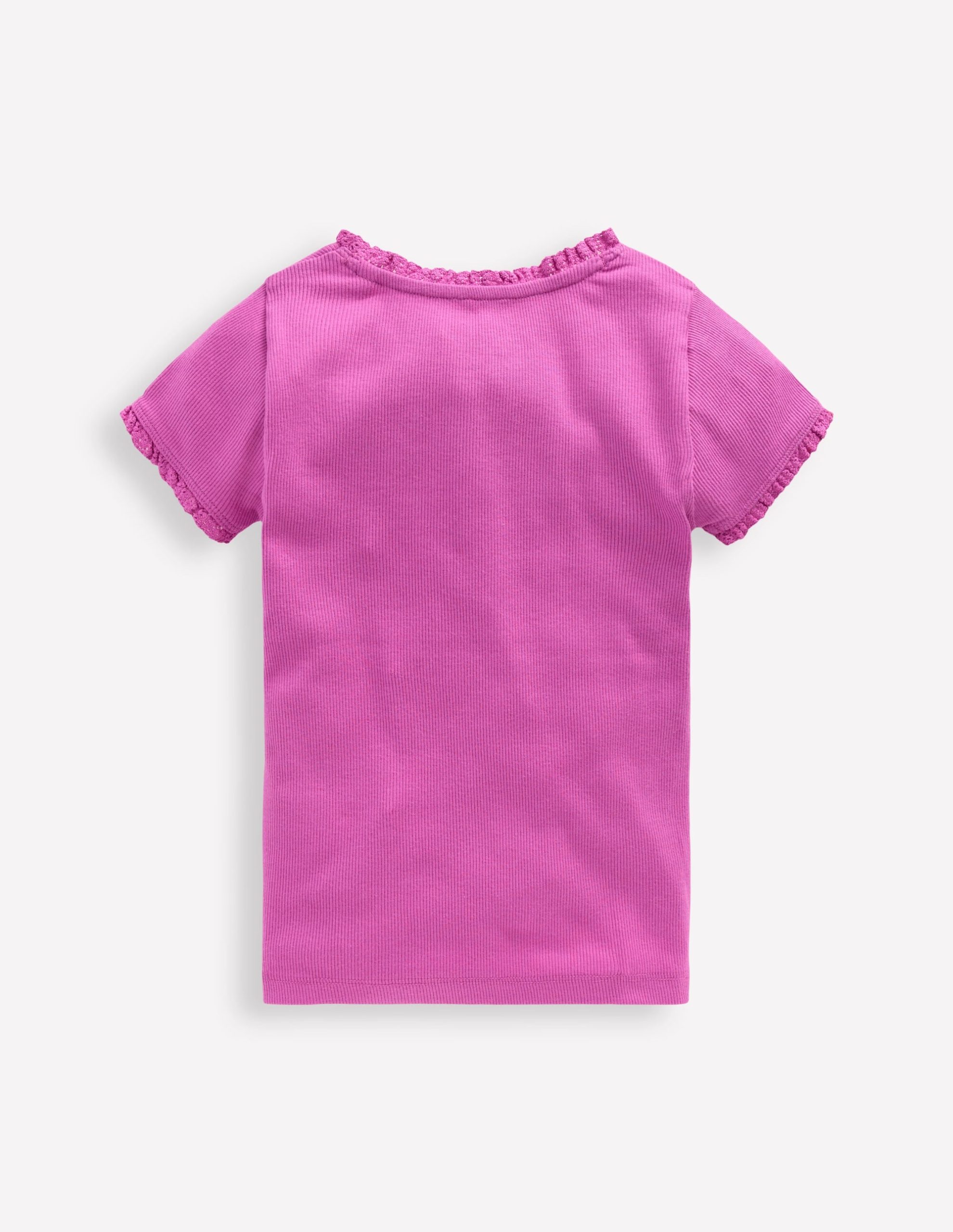 This short-sleeve T-shirt is crafted from soft ribbed cotton with a touch of stretch to give a snug fit that’s easy to layer under dungarees, jumpers and cardis. To add some extra charm it has a broderie frill around the neckline and cuffs.