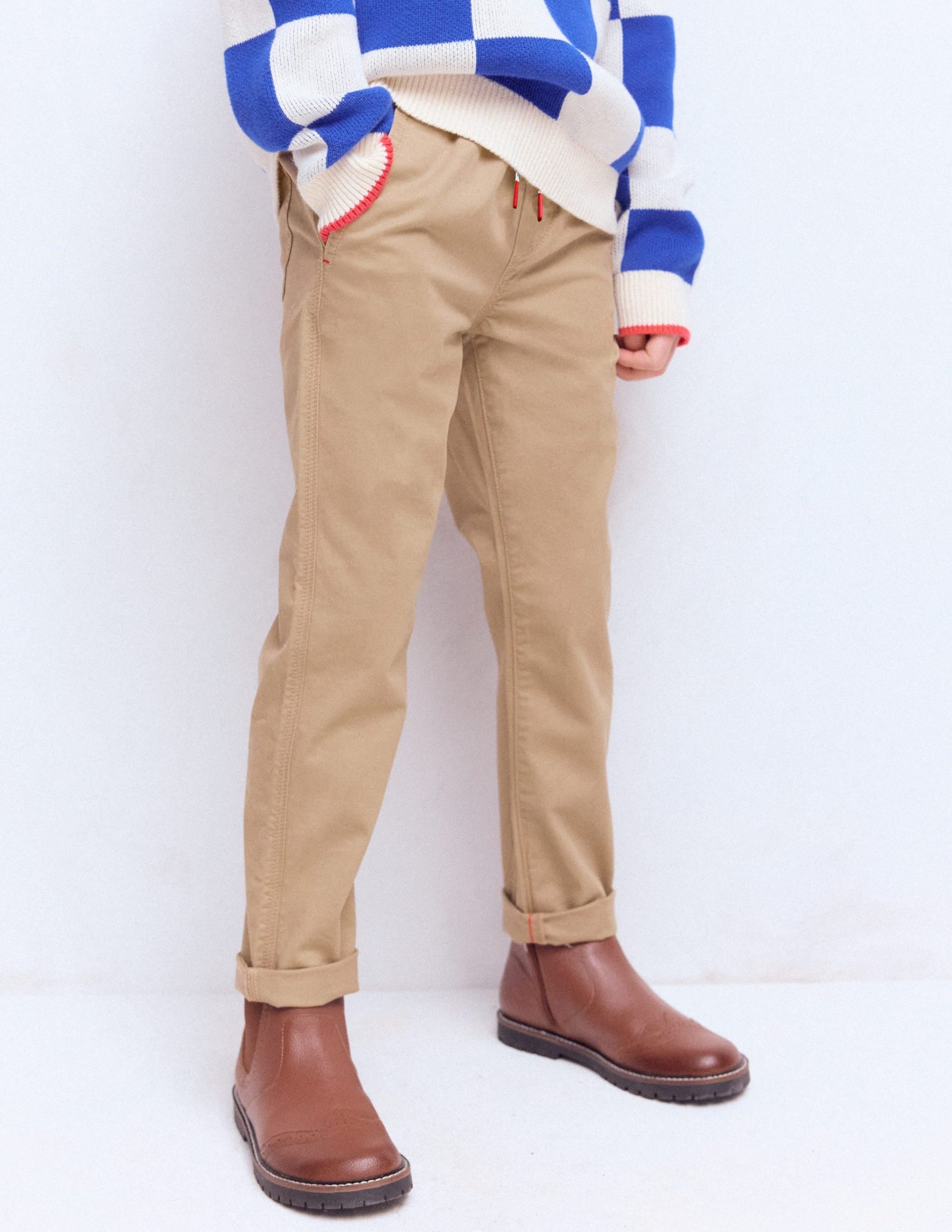 With a slim fit, these trousers are smarter than jeans but just as comfy with their elasticated waistband and adjustable drawstring. There are pockets on the front and back, so Minis won’t be short of places to store their secret notes.