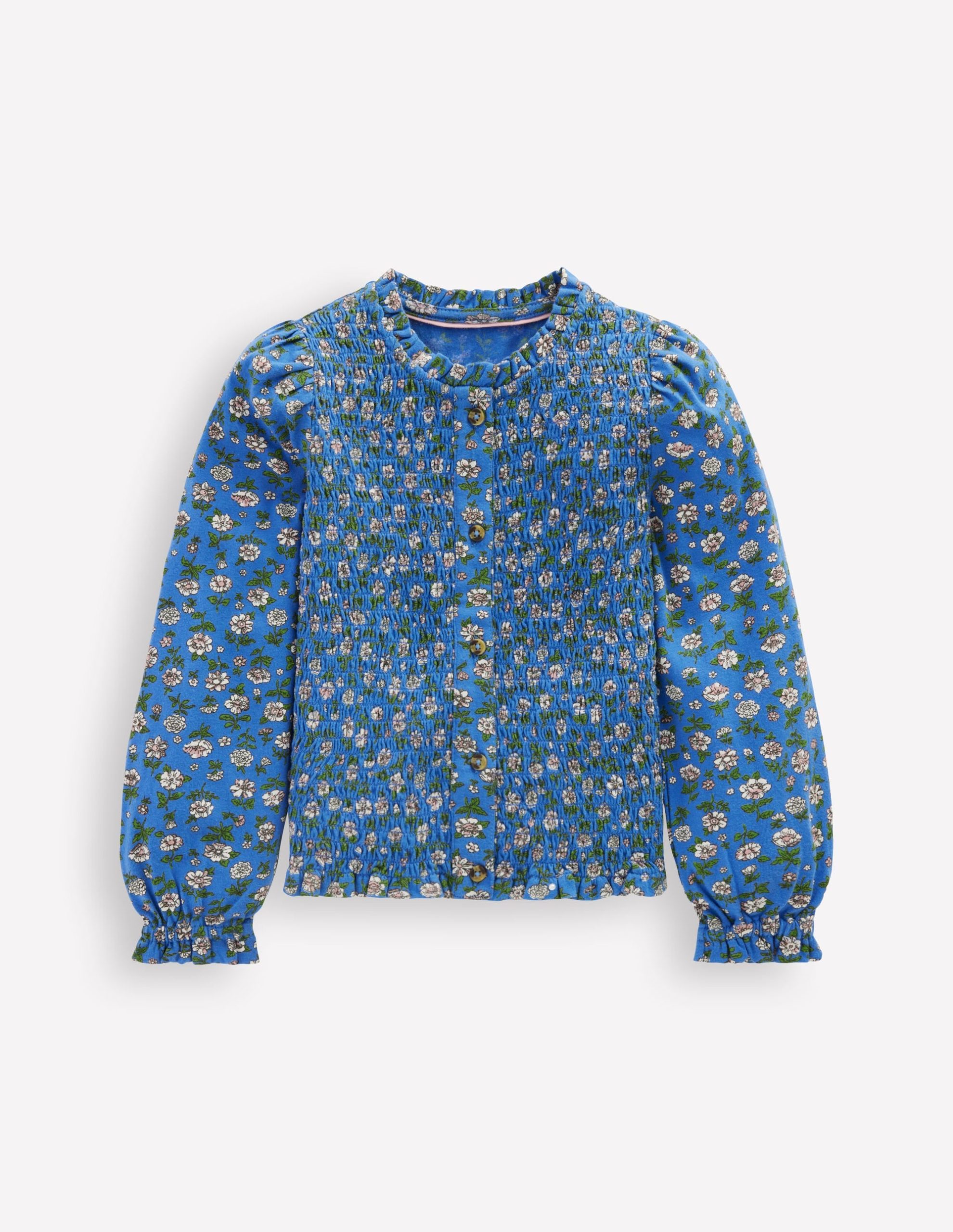 This special blouse is play date or party ready. We can’t decide what’s sweeter, the ditsy floral print, smocking or ruffles? Let’s say all of the above.