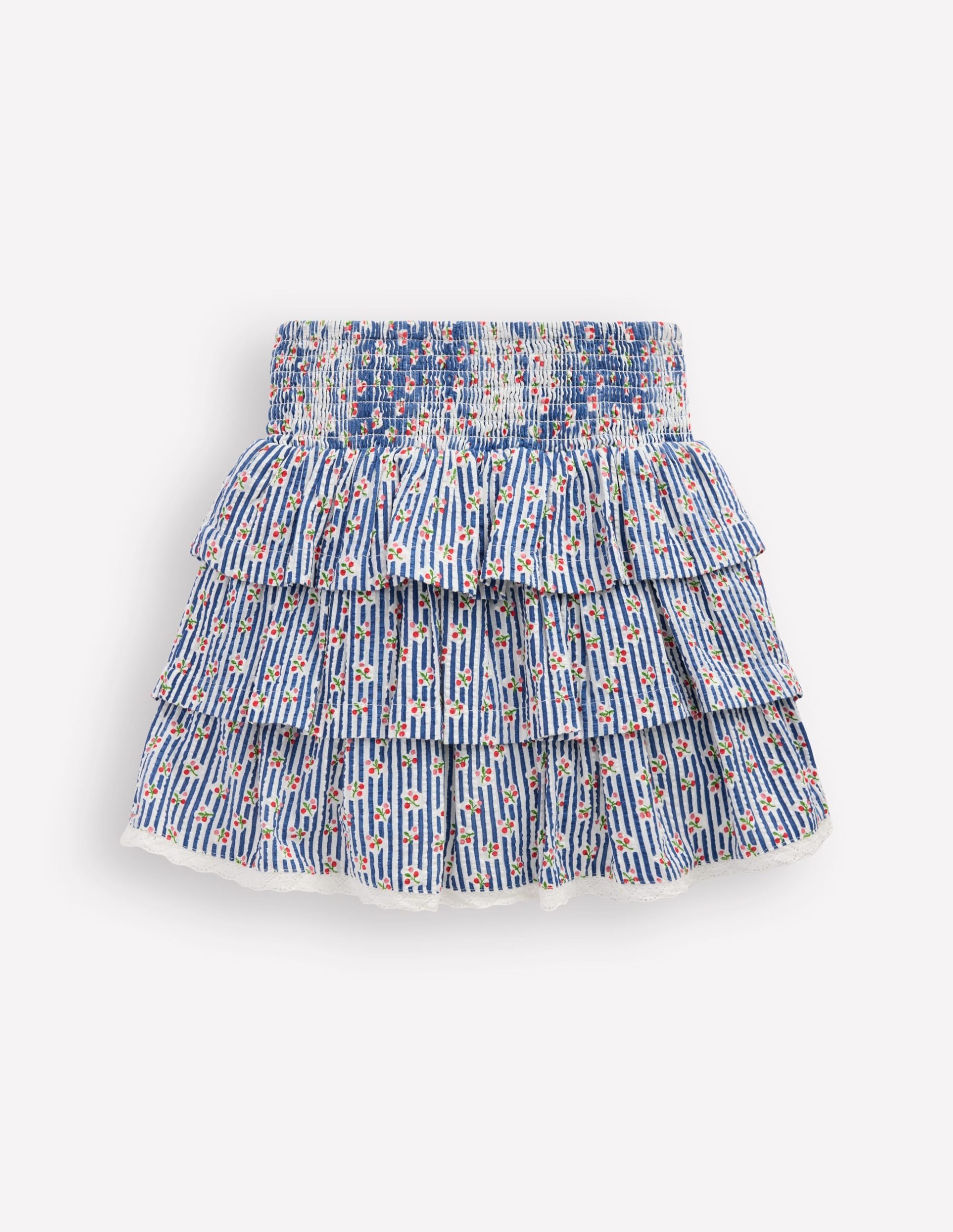 Smocked Waist Ruffle Skirt-Bluejay Cherry Stripe