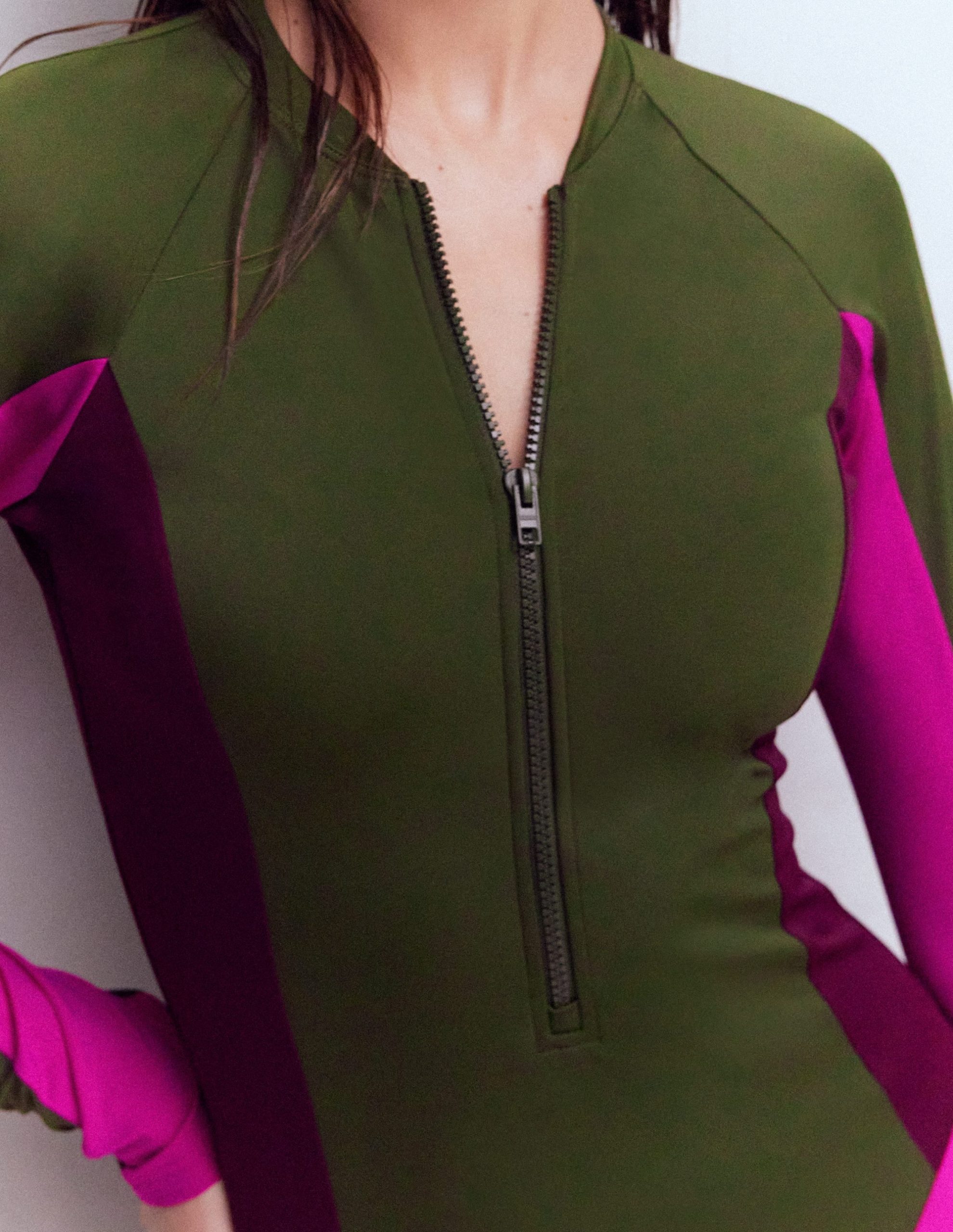 This raglan swimsuit features a handy front zip, removable cups and long sleeves for added coverage when you’re out in the sun all day (you lucky thing). Enjoy water sports in style.