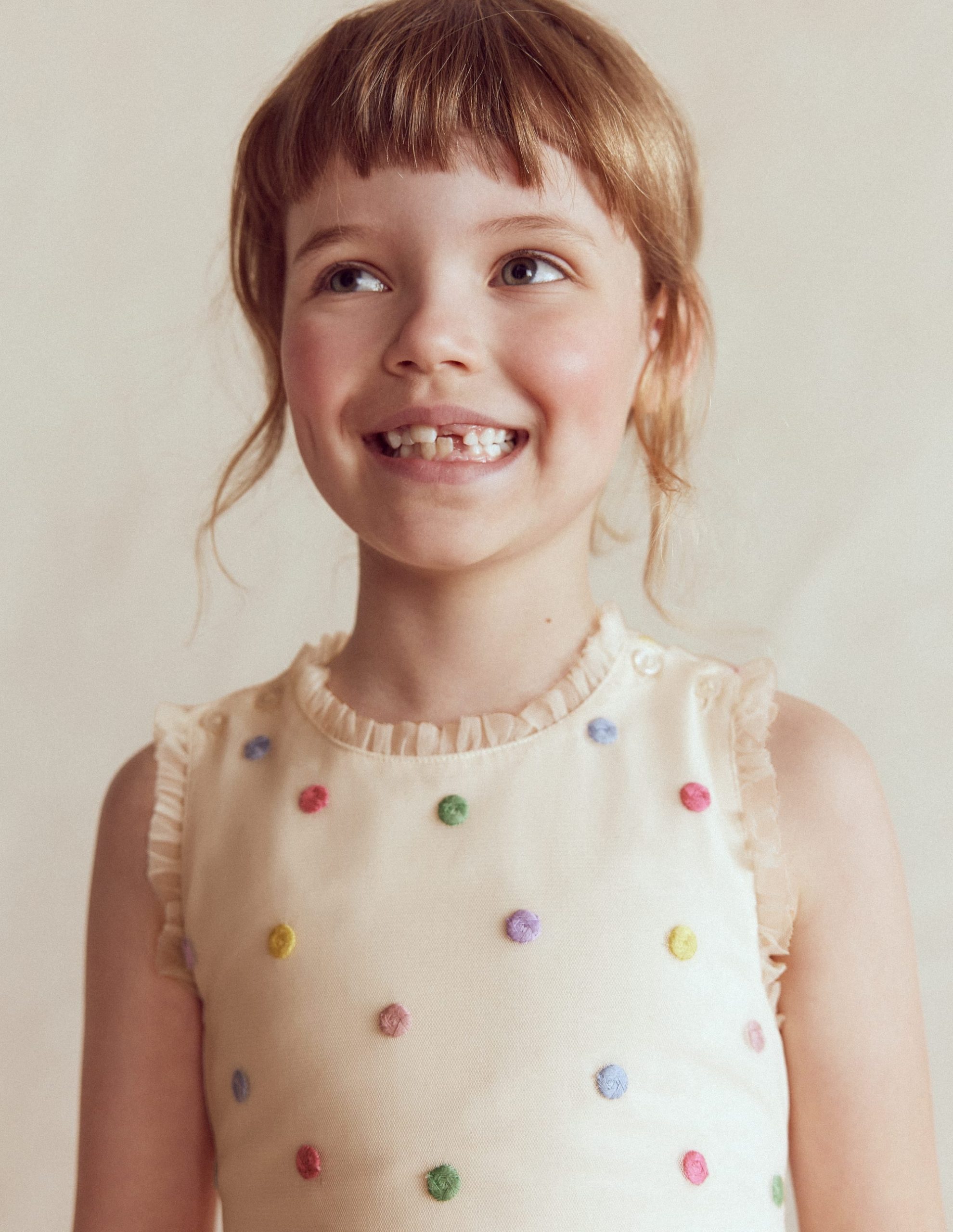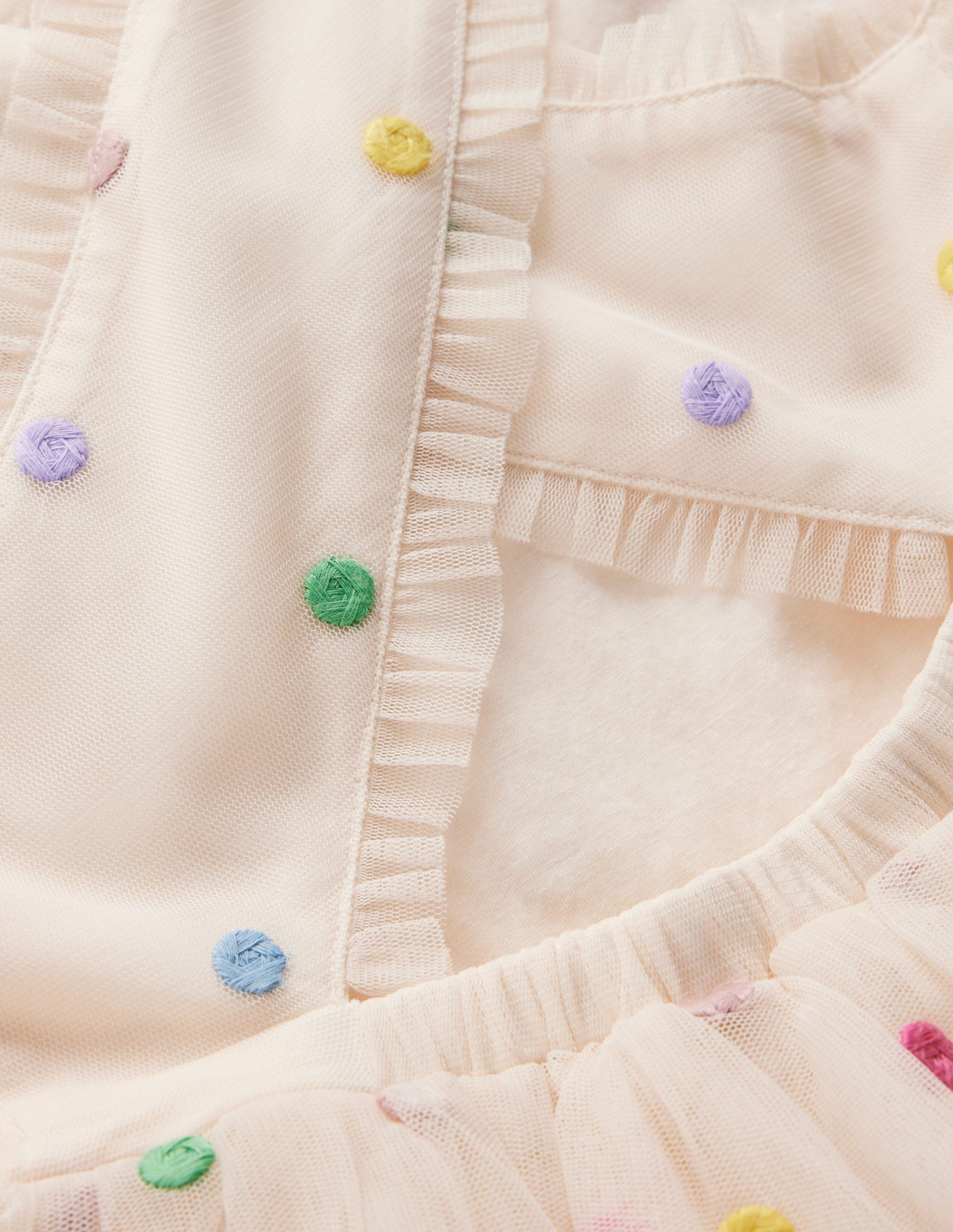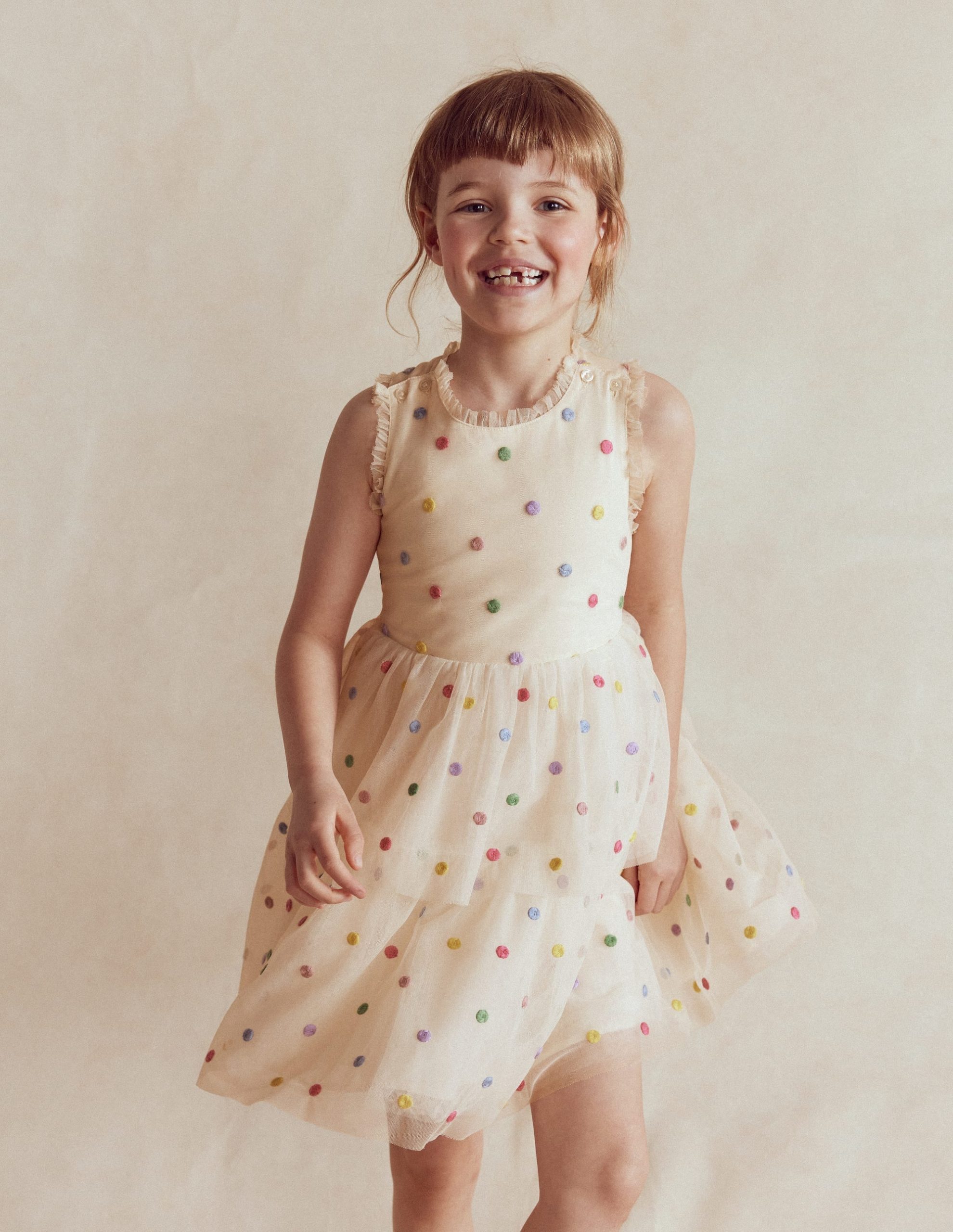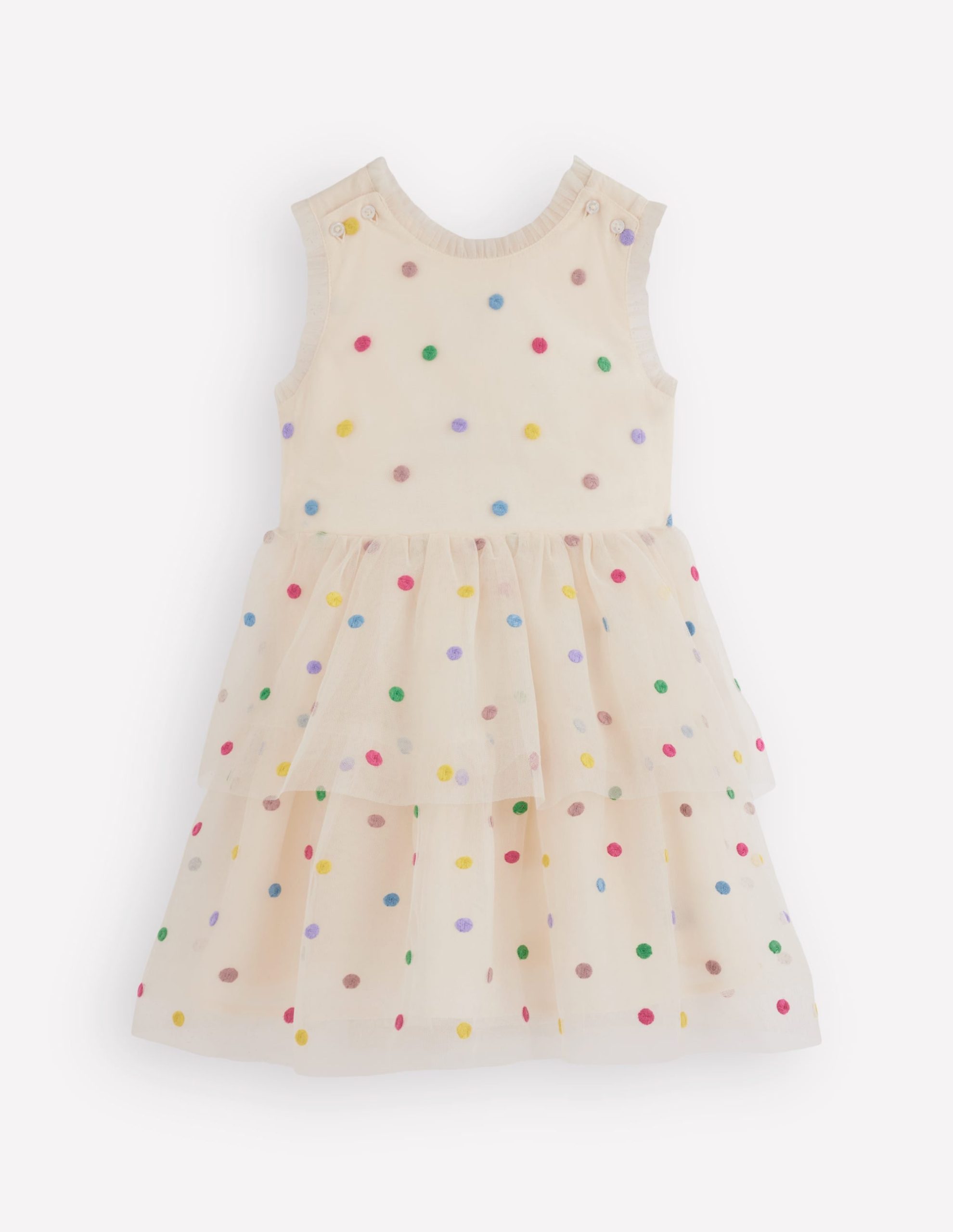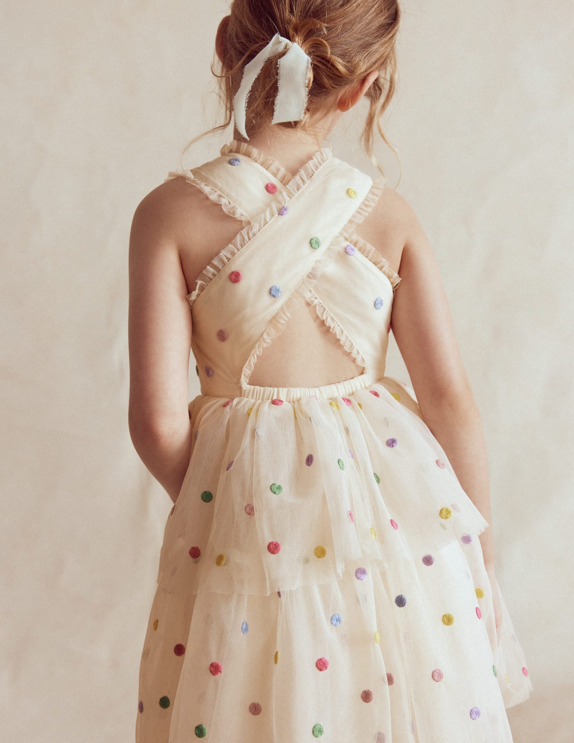 Minis will go dotty over this delightful party dress. We’ve crafted it with bouncy tulle tiers. ruffly trim (also tulle) and cross back detail ?C all made for twirling and showing off. Just add gold shoes and a gigantic ice cream (drips are part of the fun).
