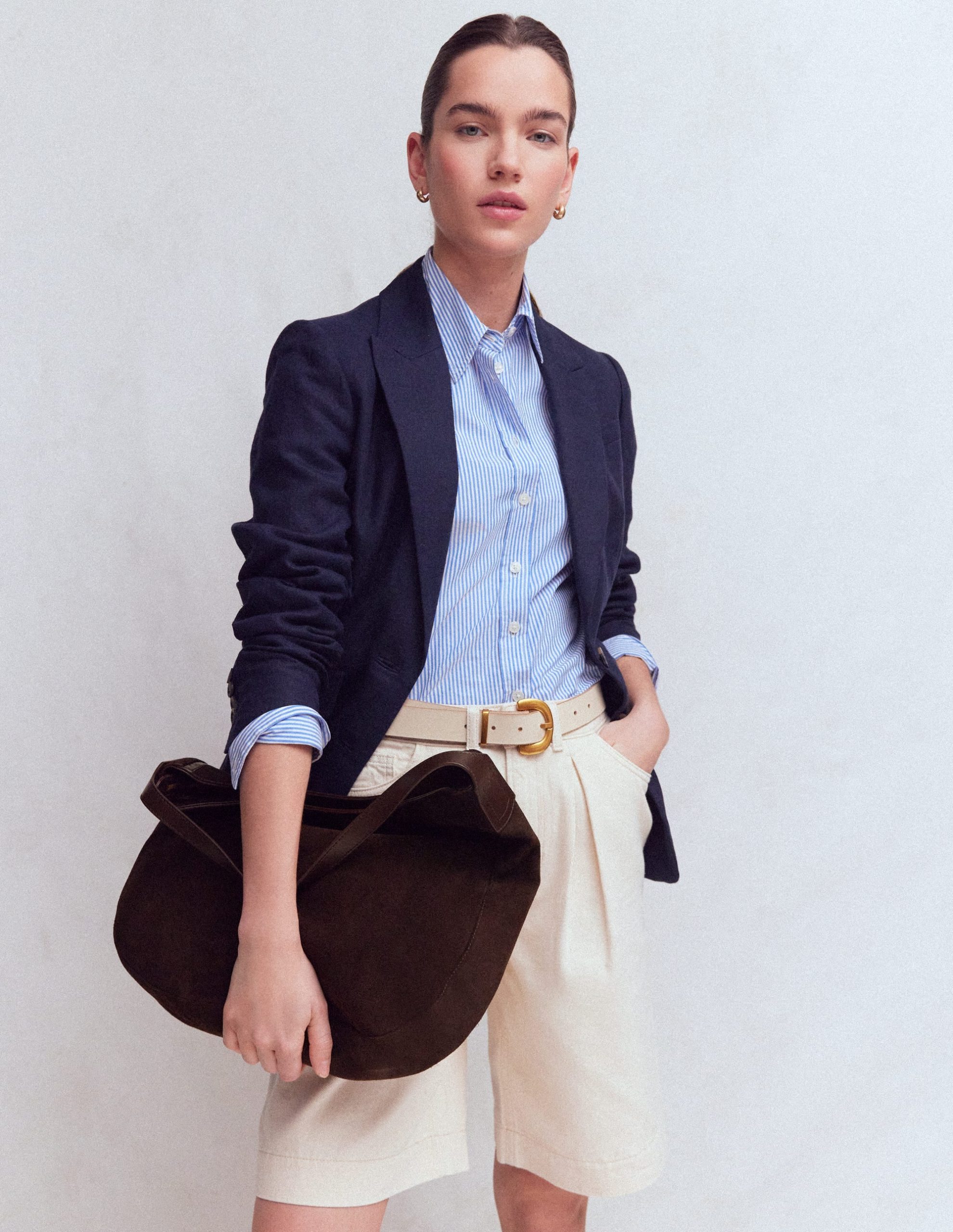A 100% suede bag with everlasting appeal. That’s down to its generous size. sleek soft shape and bitter chocolate shade. Crafted in Spain. it arrives cotton lined with a leather handle and dust bag (with our signature map print) for storage. Sophisticated yet effortless.