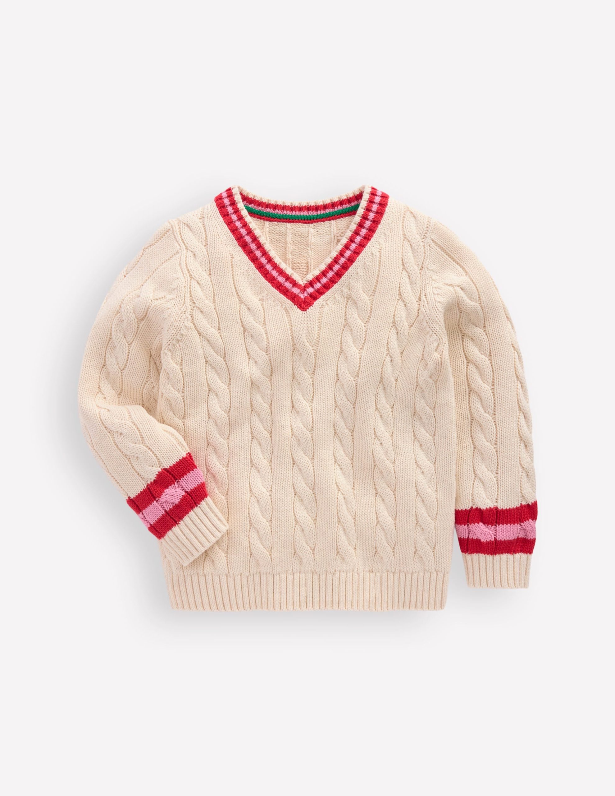 For carefree play cable knit is always a good idea. This classic cricket-style jumper is crafted from breathable cotton and we’ve added bold stripes to the V-neck and cuffs. A season-spanning style for breezy beach games and park fun. Cricket bats optional.