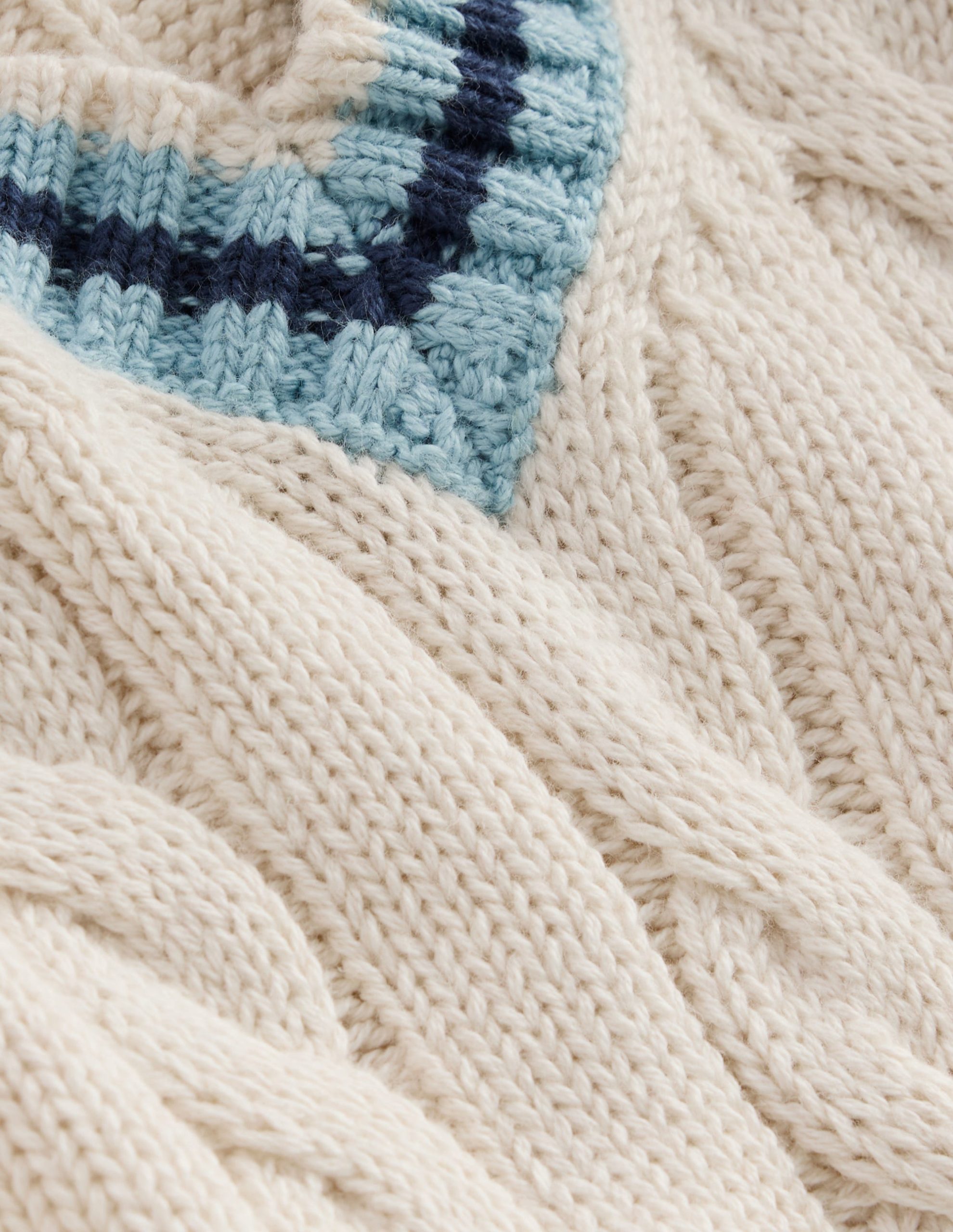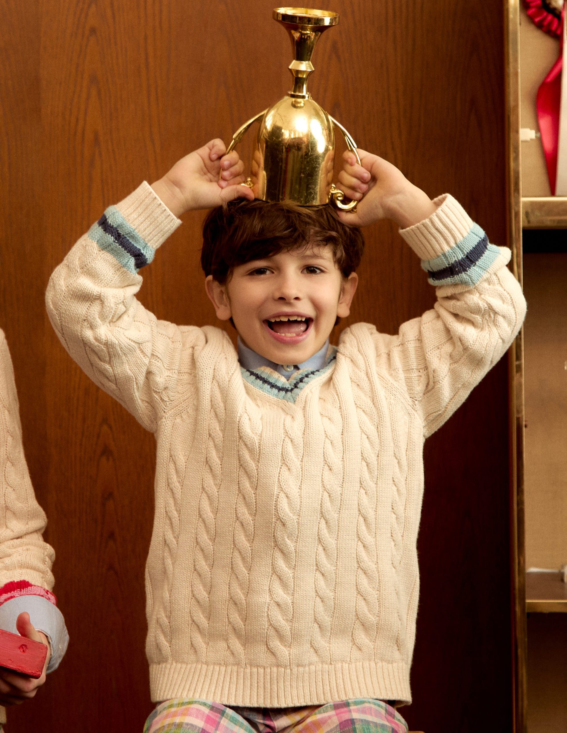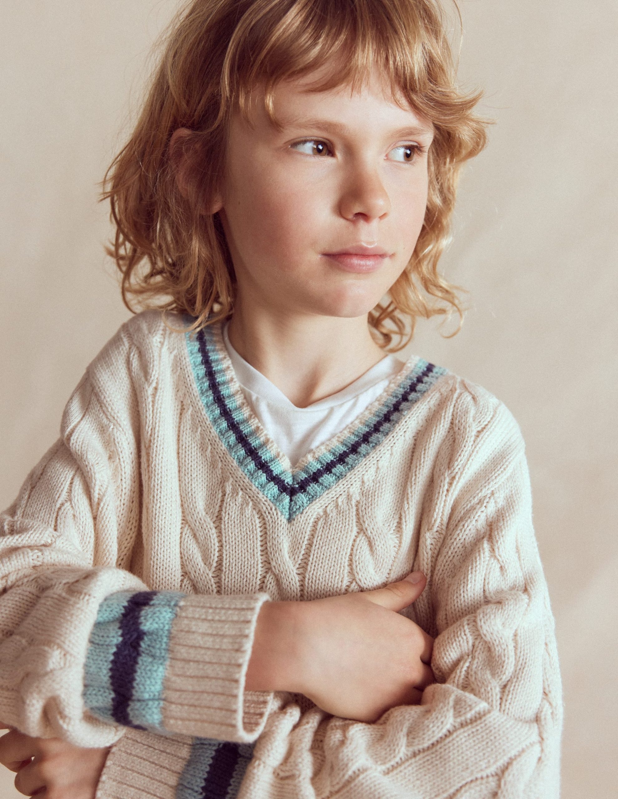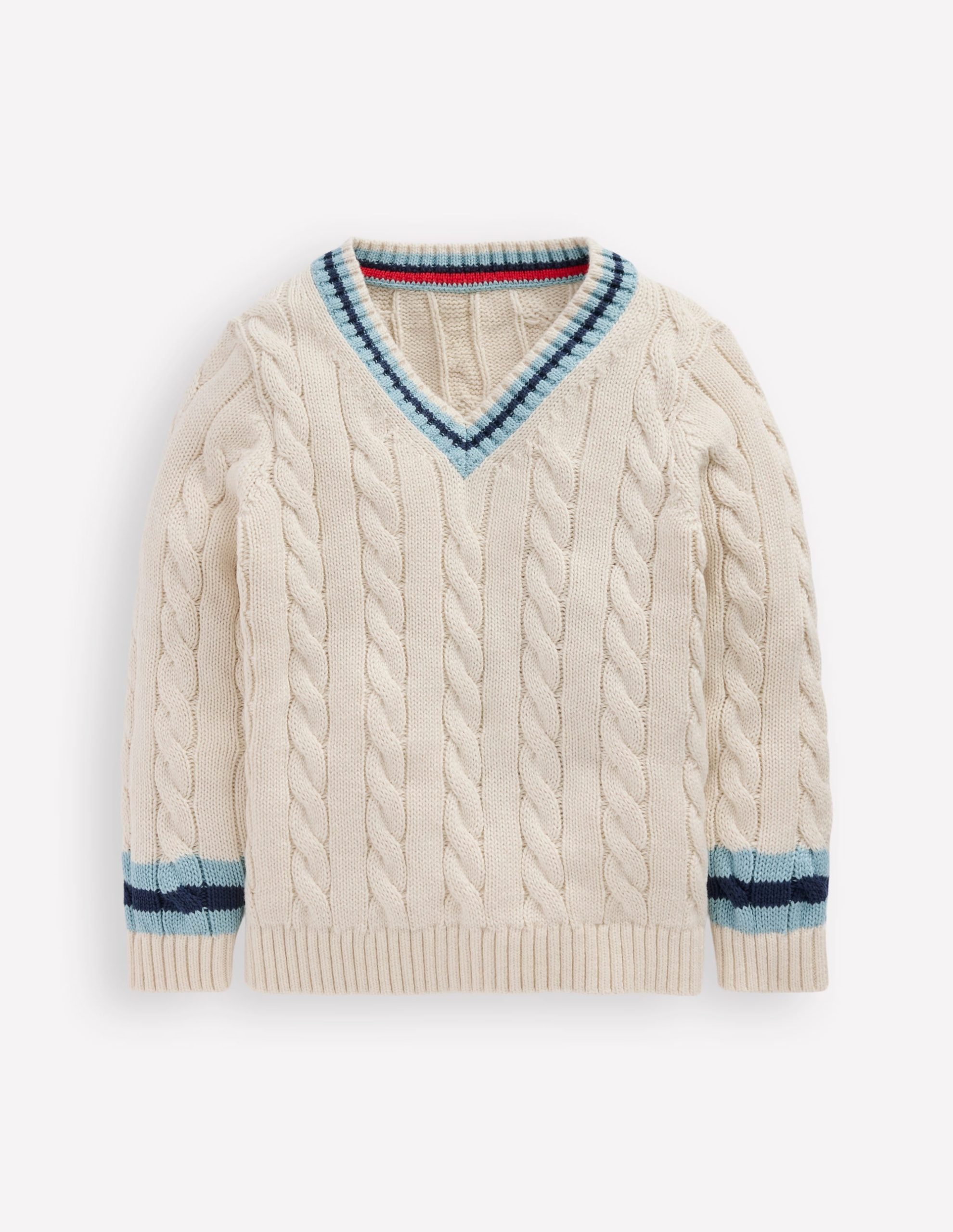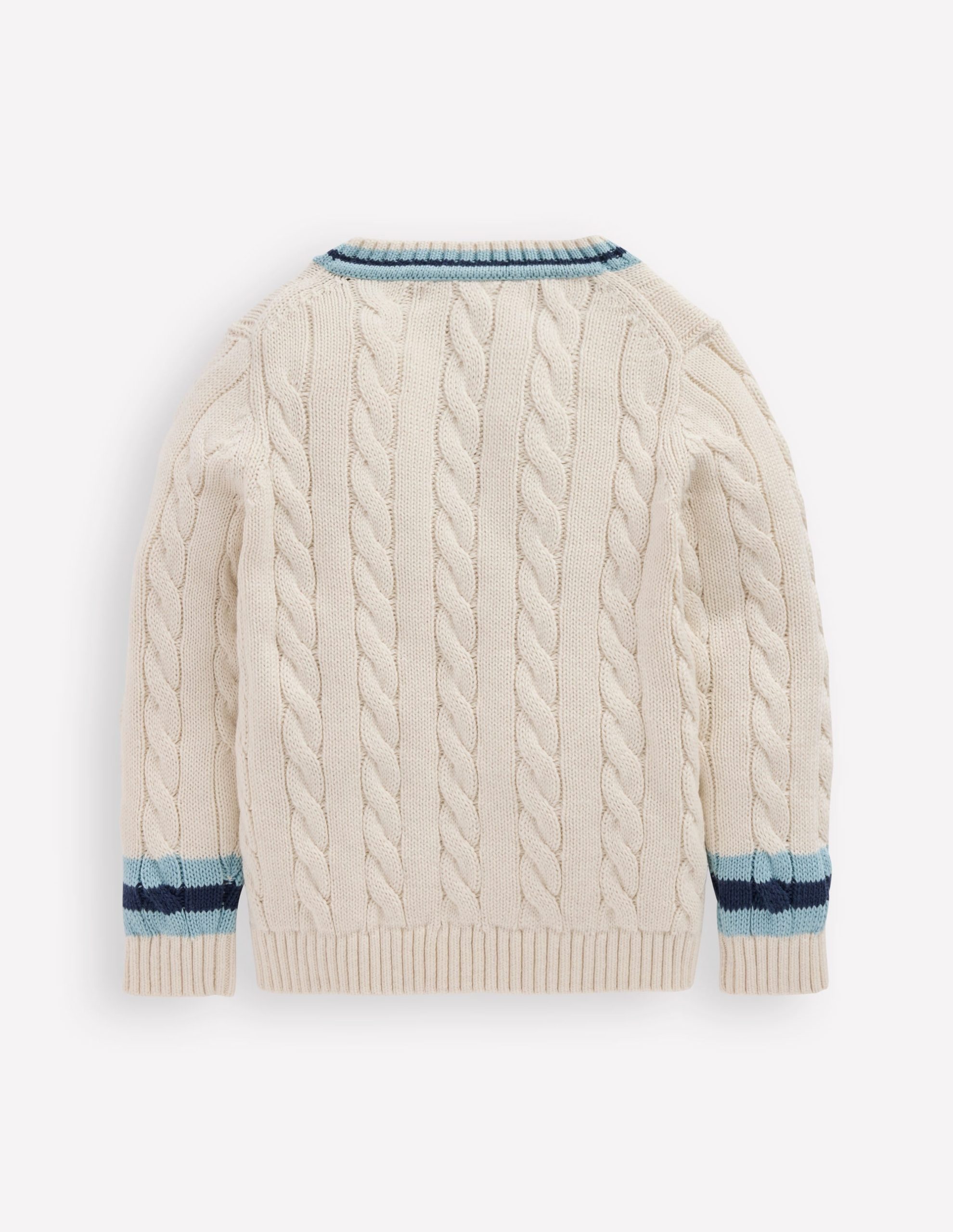 For carefree play cable knit is always a good idea. This classic cricket-style jumper is crafted from breathable cotton and we’ve added colourful stripes to the V-neck and cuffs. All you need now is breezy beach games and park fun. Cricket bats optional.