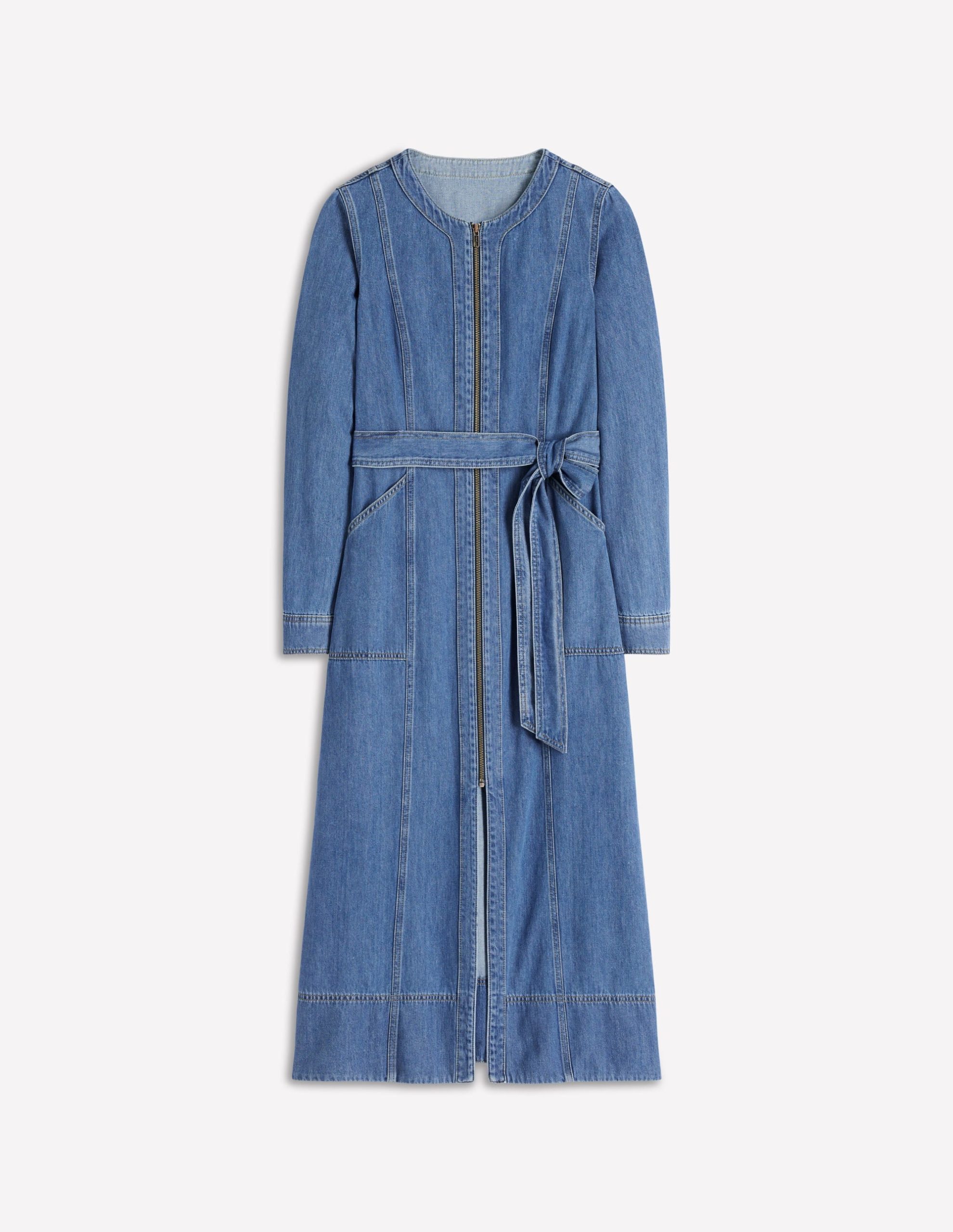The classic denim dress reimagined with a full length zip, flattering princess seams and fabric tie belt. The figure-skimming fit and long sleeves make this an easy season spanning style win.