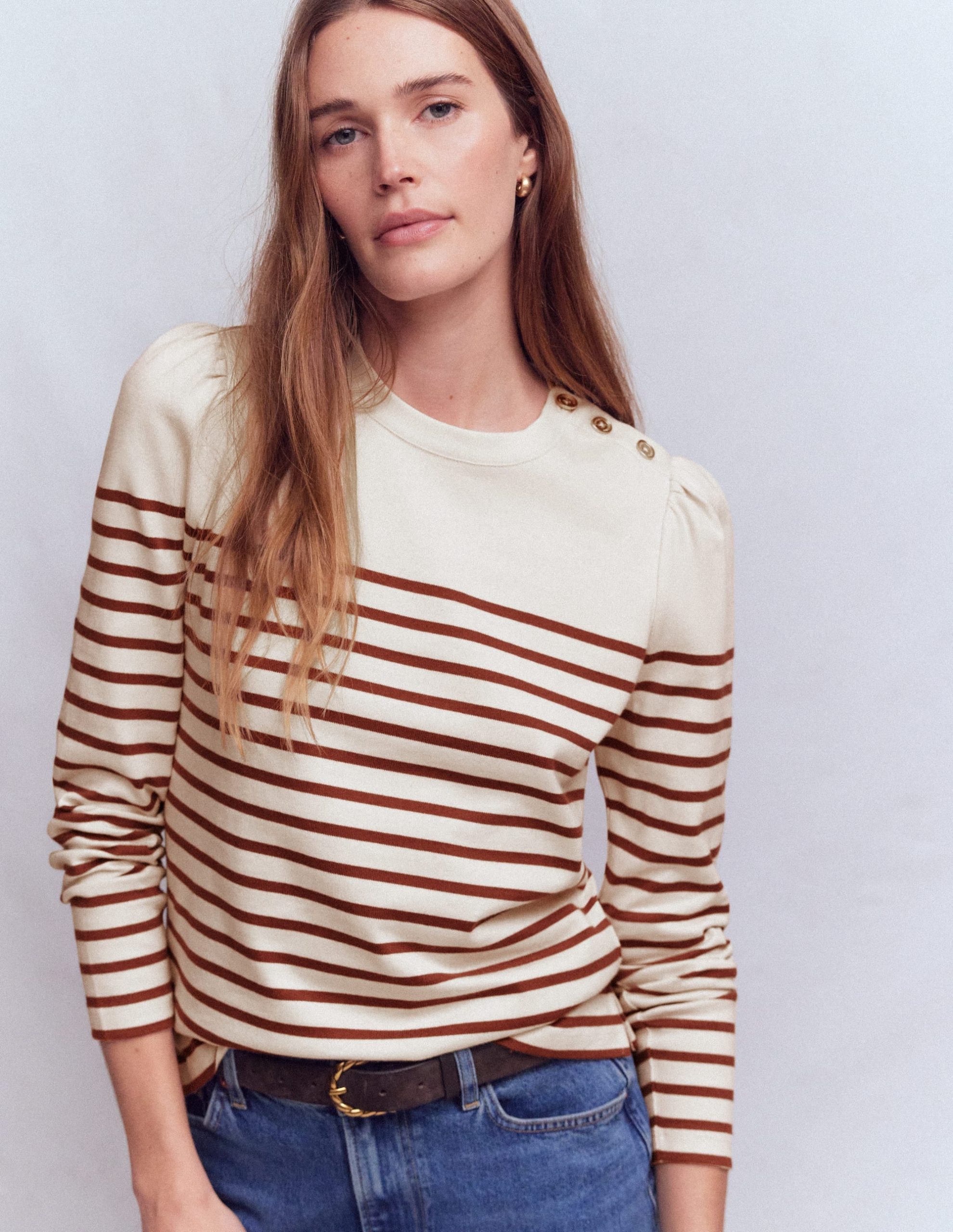 We love stripes and buttons, so we’ve added both to this nautical-inspired top. It’s crafted from 100% cotton with subtle puff sleeves. This style is perfect for weekend wanderings.