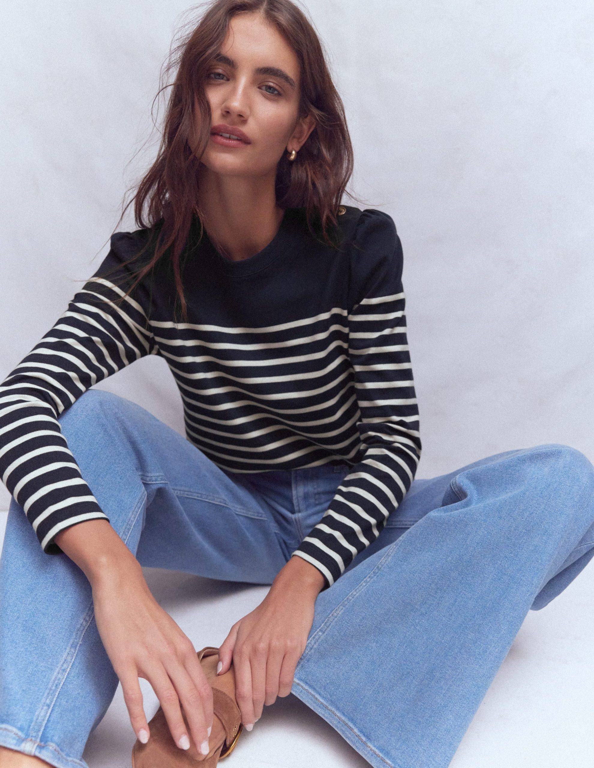 We love stripes and buttons, so we’ve added both to this nautical-inspired top. It’s crafted from 100% cotton with subtle puff sleeves. This style is perfect for weekend wanderings.