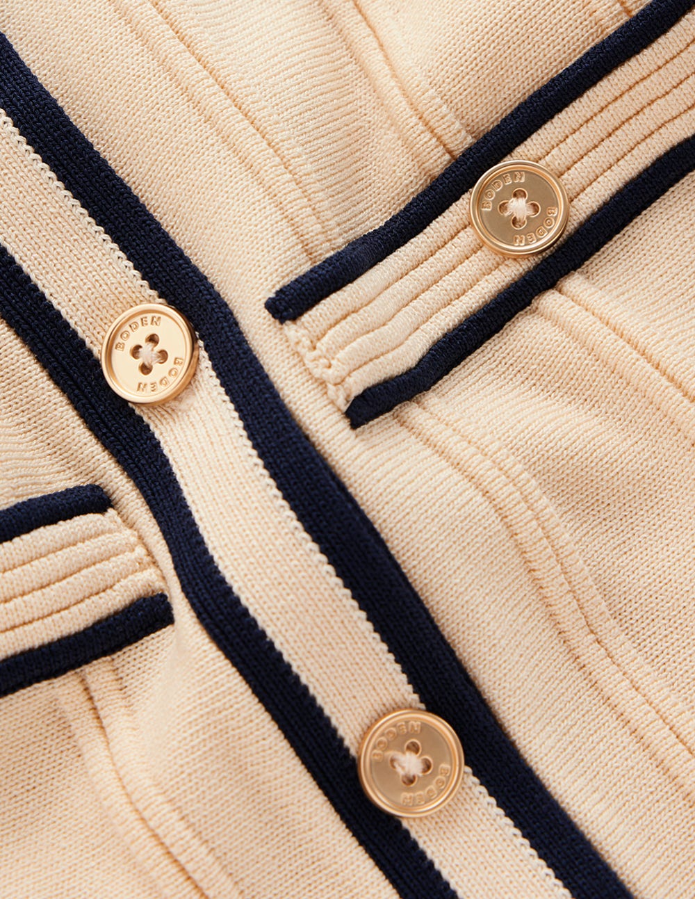 A knitted fit-and-flare dress with cap sleeves and Ottoman stitching to add definition. The contrast colours and glimmering gold-look buttons elevate this classic and elegant style further. Just add XL sunglasses and heeled sandals.