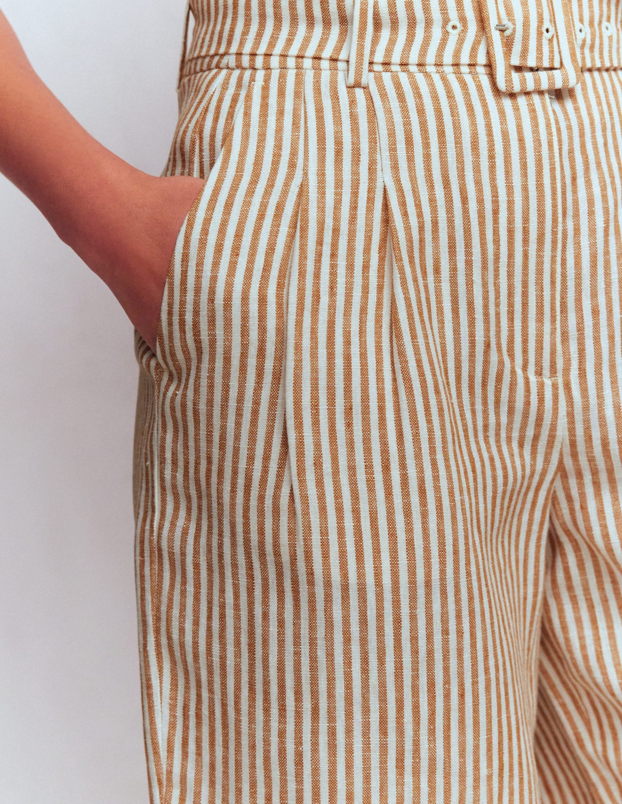 Chelsea Belted Linen Shorts-Brown. Ivory Ticking Stripe