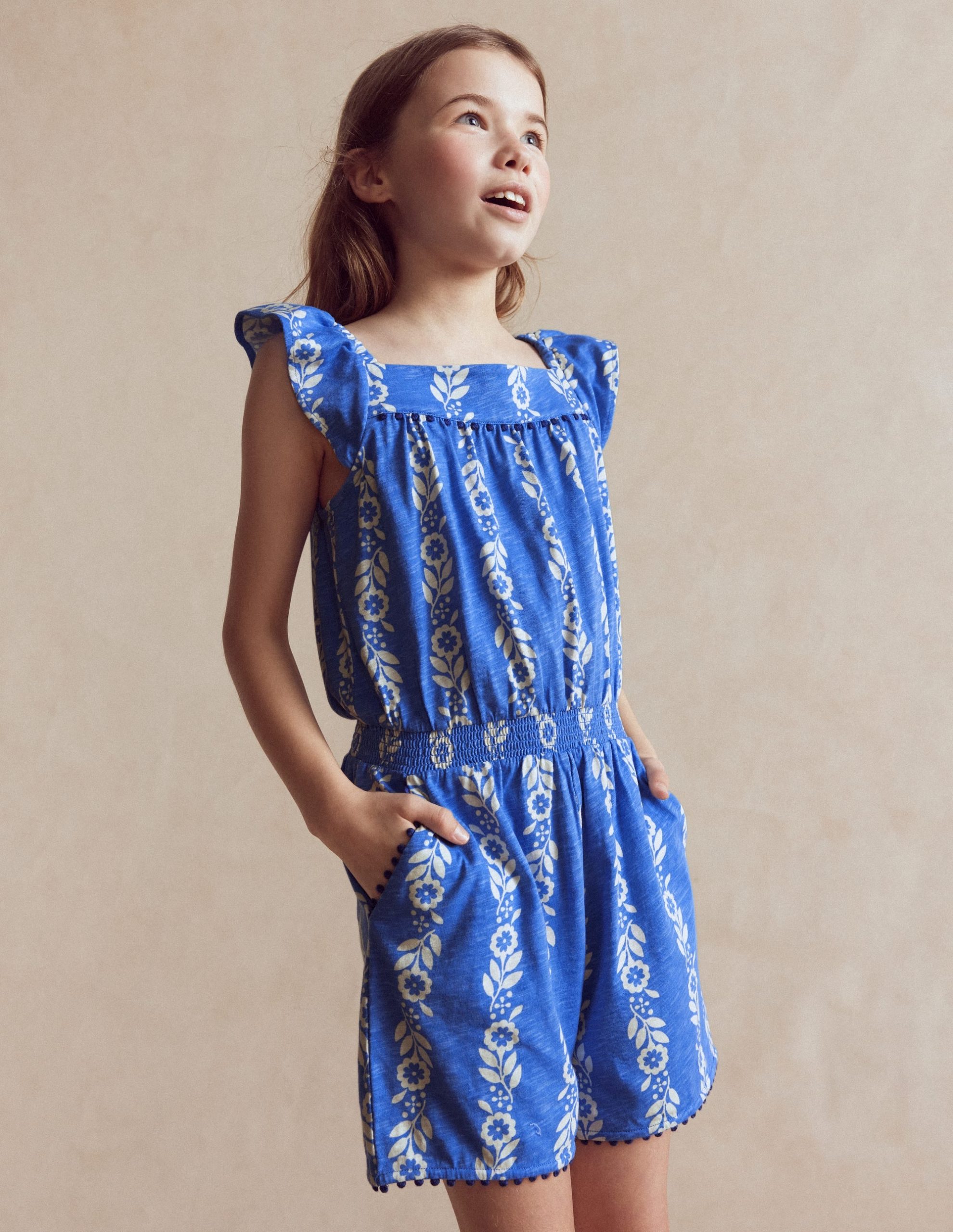 The frills. pom trim and whimsy spring prints: this adorable jersey cotton playsuit makes adventures all the more fun and getting dressed really easy. The shirring is perfectly placed to add comfort and ease of movement. Now. where’s the nearest ice-cream van