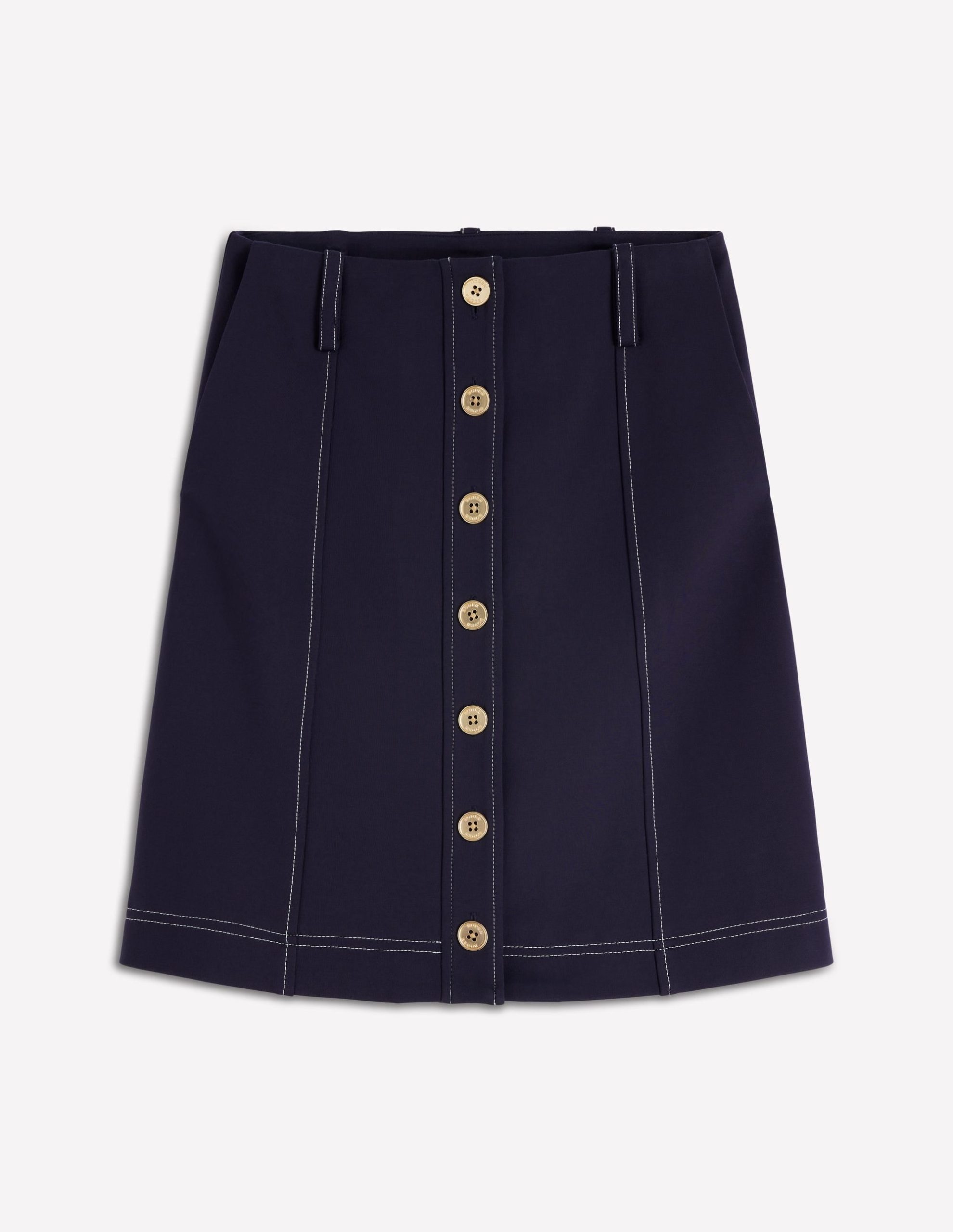 The reason ponte is such a great choice for workwear is because it offers structure without compromising on comfort. This short skirt has contrast stitching for a smart tailored look and chunky buttons down the front.