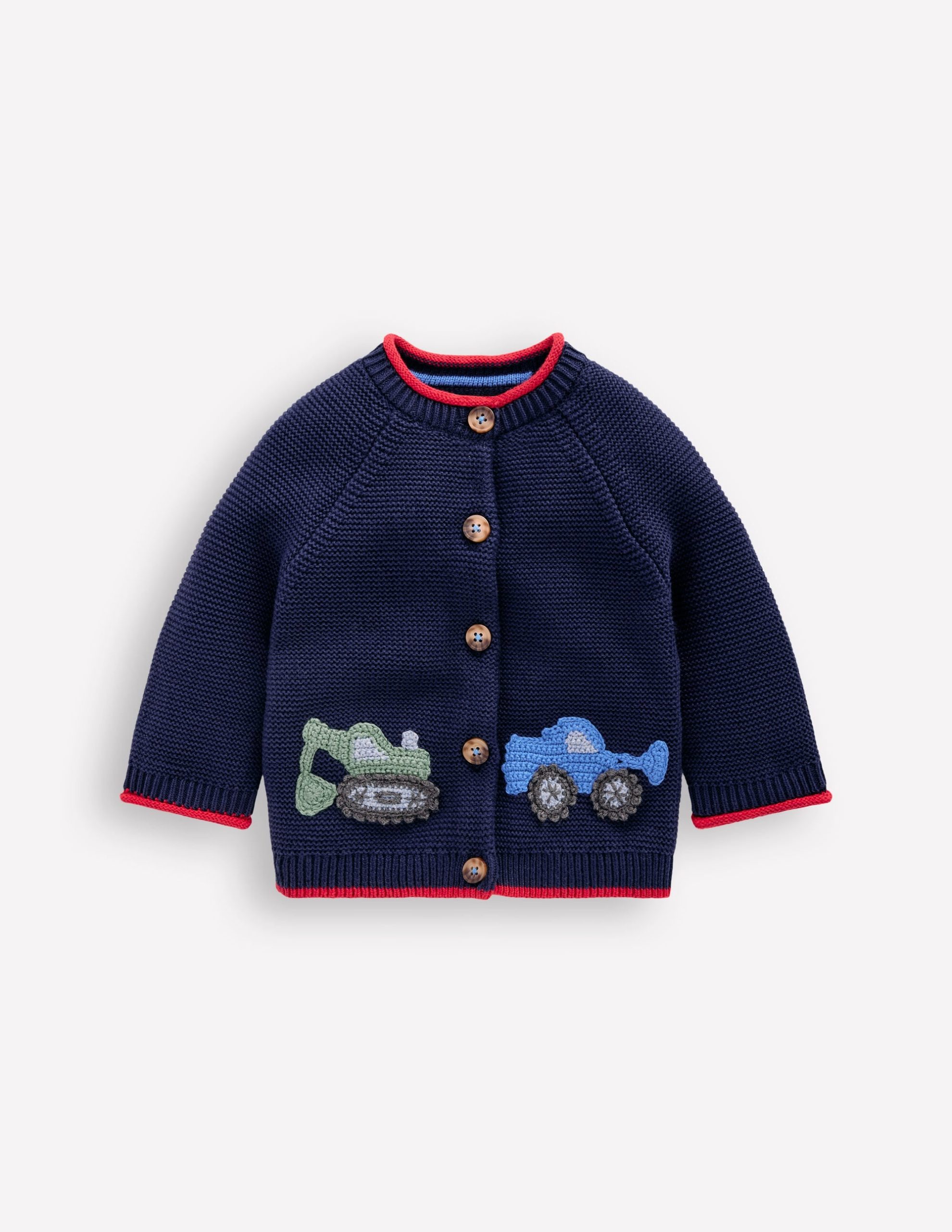 Made for Mini digger enthusiasts, this pure cotton cardigan features hand crocheted appliqué vehicles, contrast trim and bright colours to create a cosy style that can be treasured and handed down. There’s also a sunny breakfast-themed egg design.